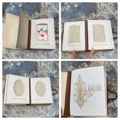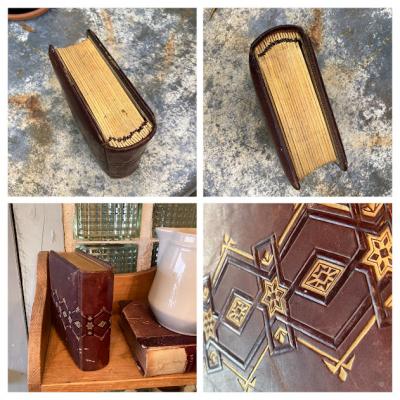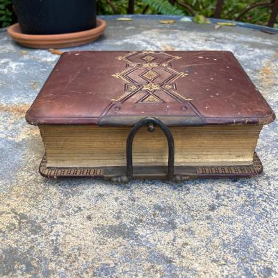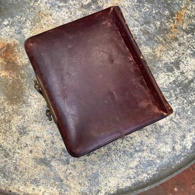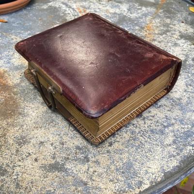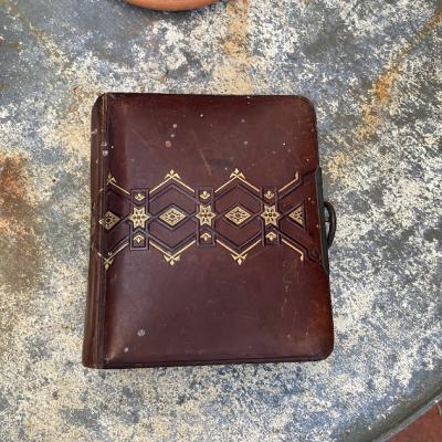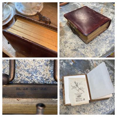 特別な写真を大切に保管するためのアルバム。側面はゴールドで彩色され、しっかりとした真鍮の金具が付属。そのまま飾っておくだけでも絵になるお品です。真鍮の金具部分に「NL 28 Mai 18●1」のように見える刻印が入っていました。(●部分は判読不能) 表紙をめくると元の持ち主が書いた鳥のイラストが1枚入っていました。最初のページには「ALBUM」と美しいデザイン装飾されて描かれています。次のページからは写真を下から入れることができるページが16ページあり、四角フレームと丸いフレームが交互に組み合わせられています。それぞれのページは約2mmほどとしっかりとした造りです。ぜひお気に入りの写真を飾っていただけたらと思います。表面には経年による小さな傷などがありますが、これらも含めてお楽しみいただける方、店舗用のディスプレイをお探しの方におすすめ。ピカピカの新品をお求めの方はご遠慮ください。福岡市南区の店舗にてお渡しもできますのでお気軽にどうぞ!