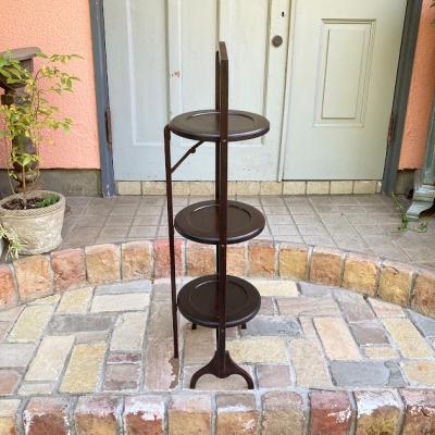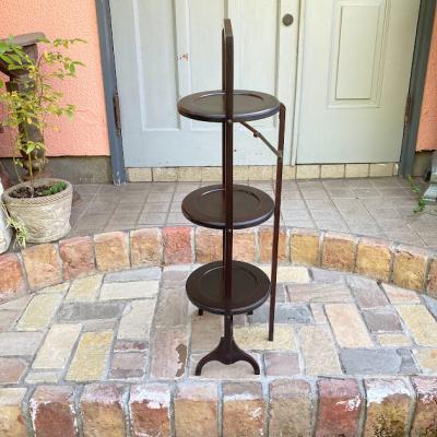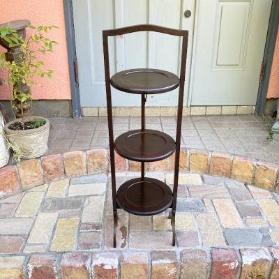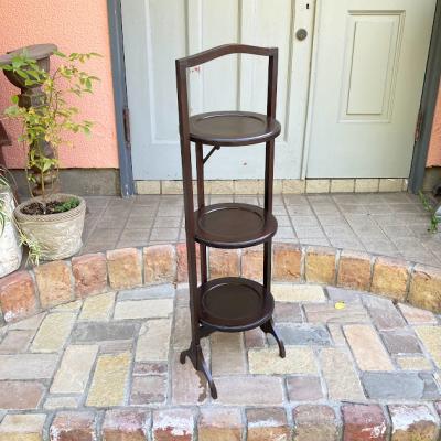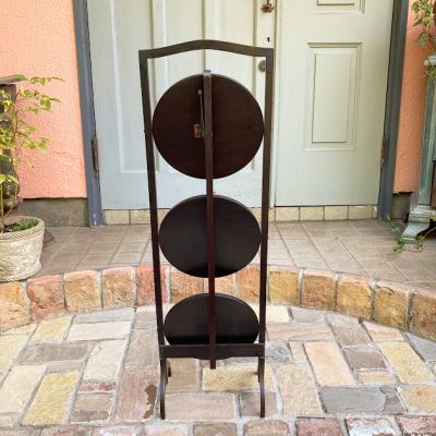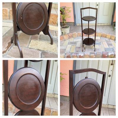 折りたたみできるケーキスタンド。アフタヌーンティーはもちろんのこと、お気に入りの小物を飾るのにも便利な折りたたみ式。約18㎝ほどスリムになるため収納スペースを取りません。マホガニー、推定1940年代とのこと。クラシックなお部屋作りを楽しんでいらっしゃる方や、店舗のディスプレイ台をお探しの方におすすめ。アンティークらしい風合いはありますので、ピカピカの新品をお求めになる方はご遠慮ください。福岡市南区の店舗にてお渡しもできますのでお気軽にどうぞ!