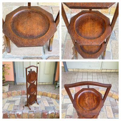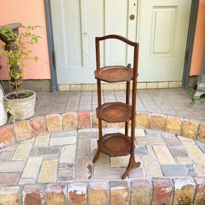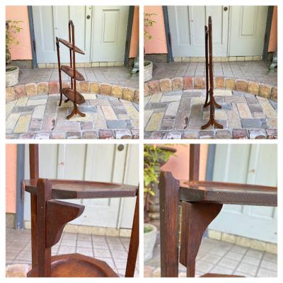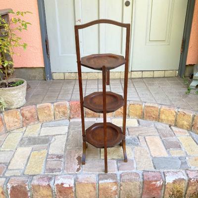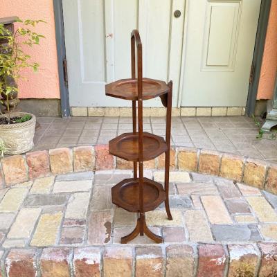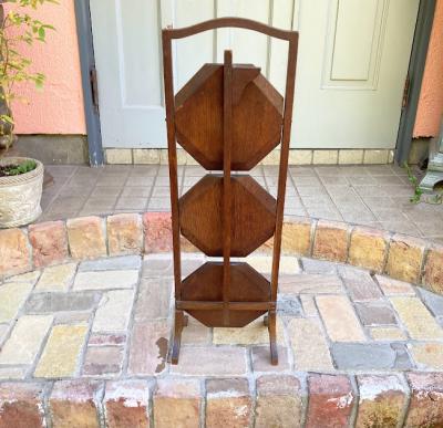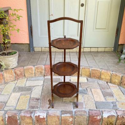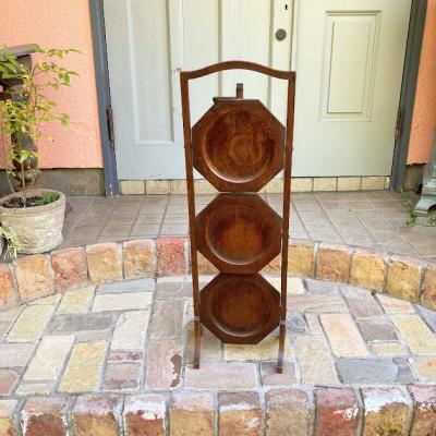 折りたたみできるケーキスタンド。アフタヌーンティーはもちろんのこと、お気に入りの小物を飾るのにも便利な折りたたみ式。約17㎝とスリムになるため収納スペースを取りません。オーク材、推定1940年代とのこと。たたむ時は後ろの小さなパーツを横にスライドしてから折りたたみます。木目のしっかりとした8角形のタイプですので、ナチュラルなお部屋作りを楽しんでいらっしゃる方や、店舗のディスプレイ台をお探しの方におすすめ。一番上のトレイに少し輪ジミのように見える部分があります。これらも含めて古いお品がお好きな方向き。ピカピカの新品をお求めになる方はご遠慮ください。福岡市南区の店舗にてお渡しもできますのでお気軽にどうぞ!