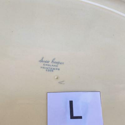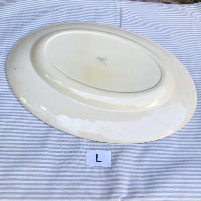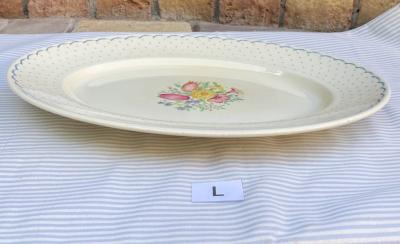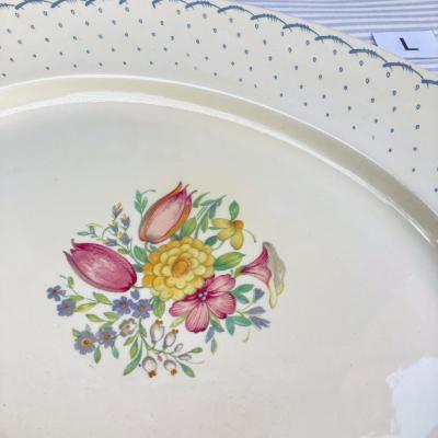 スージークーパー「プランタン」の大きな楕円形のプレートが入荷しました!約40㎝もある大きな「L」サイズです。スージーの作品の中でも人気のデザインで周りはレースのような模様に小さな雫が取り囲む可愛らしい雰囲気に包まれています。今回同じデザインのサイズ違いが入荷しておりましたので、サイズを比較した画像がございますが、一番大きなサイズとなります。ホームパーティや、店舗のディスプレイ台としても大活躍してくれそうですね。大きな割れなどはありませんでしたが、裏面に製造時にできた小さな傷や、目を凝らしてみると小さな傷などを含みます。1930年~64年頃。時代を感じる雰囲気を楽しみたい方におすすめ。ピカピカの新品をお求めの方はご遠慮ください。福岡市南区の店舗にてお渡しもできますのでお気軽にどうぞ!