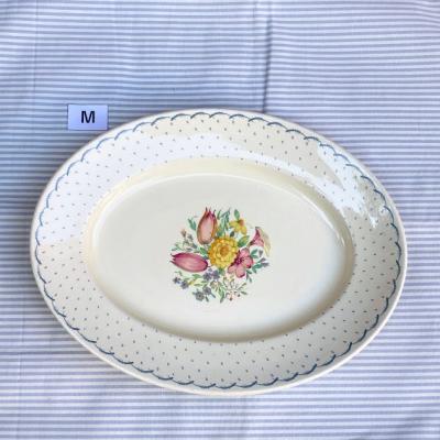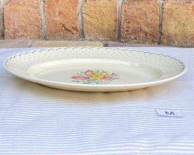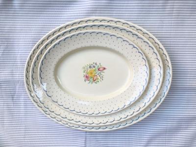 スージークーパー「プランタン」の楕円形のプレートが入荷しました!こちらは約36㎝の「M」サイズです。スージーの作品の中でも人気のデザインで周りはレースのような模様に小さな雫が取り囲む可愛らしい雰囲気に包まれています。今回同じデザインのサイズ違いが入荷しておりましたので、サイズを比較した画像がございますが、真ん中のサイズとなります。ホームパーティや、店舗のディスプレイ台としても大活躍してくれそうですね。大きな割れなどはありませんでしたが、裏面に製造時にできた小さな傷や、表面に目を凝らしてみると小さな剥がれやうっすらと小さな傷を含みます。1930年~64年頃。時代を感じる雰囲気を楽しみたい方におすすめ。ピカピカの新品をお求めの方はご遠慮ください。福岡市南区の店舗にてお渡しもできますのでお気軽にどうぞ!
