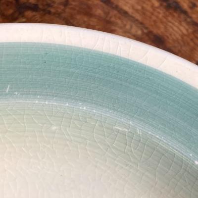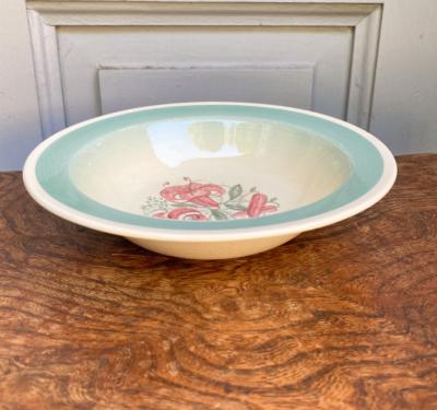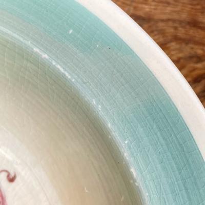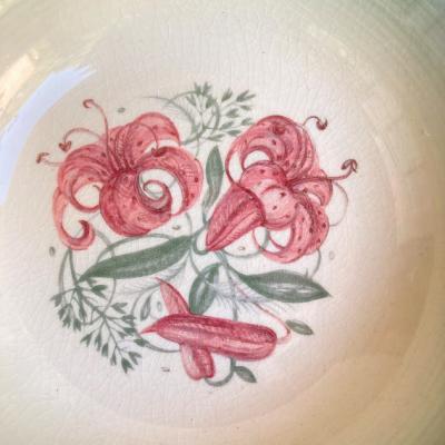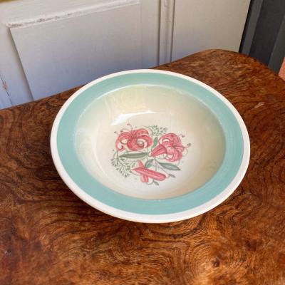 1941年にイギリスで空襲が収まったころにデザインされたのがこちらの「タイガーリリー」というデザインだそうです。スージーはヴィクトリア時代のイラストブックや野生の花々からインスピレーションを受けていたとか。力強さを感じる素敵な作品ですね。約16㎝のボウルはサラダやシリアル、ヨーグルトなど使い勝手の良さそうなサイズ感。周りの優しいグリーンの部分には少し剥れた部分が見られ、うっすらと貫入があります。貫入とは陶器と釉薬の縮みの差による網目状のことで、ヒビとは異なります。長い年月を経た証としてお考えいただければ幸いです。大きな割れなどは見受けられず、中心のユリは綺麗な状態を保っています。これからの時間をこの小さなボウルと共に過ごしていきたい方や、店舗什器などをお探しの方におすすめ。同じデザインのものが少しだけ在庫があります。気になる方はお気軽にお問い合わせください。ピカピカの新品をお求めの方はご遠慮ください。福岡市南区の店舗にてお渡しもできますのでお気軽にどうぞ!