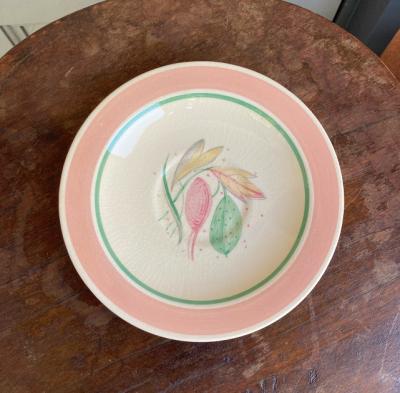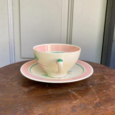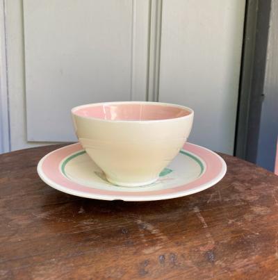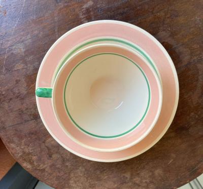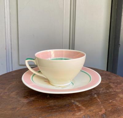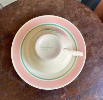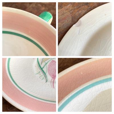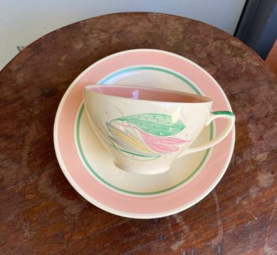 スージークーパーのロングリーフデュオ(ピンク)のカップ&ソーサー。1939年頃。カップは綺麗な状態を保っておりますが、ソーサーの表面にアンティーク特有の貫入と、ソーサーの裏面に一部だけ5mmほどのカケた部分があります。貫入とは陶器と釉薬の縮みの差による網目状のことで、ヒビとは異なります。長い年月を経た証としてお考えいただければ幸いです。ソーサーの裏面に一部カケがあるため、訳ありのお求めやすい価格にて表示してあります。裏側だけなので気にしない方にはおすすめです!ピカピカの新品をお求めの方はご遠慮ください。福岡市南区の店舗にてお渡しもできますのでお気軽にどうぞ!