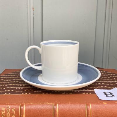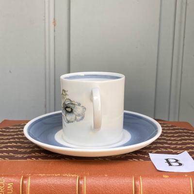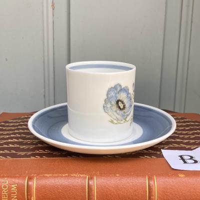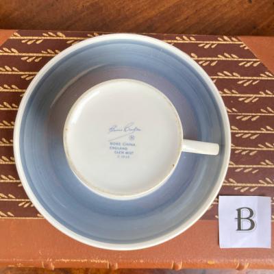 ブルーグレイの色合いが素敵な「グレンミスト」。1951年~1966年スージークパーチャイナ時代のものです。スコットランドやアイルランドの谷間にの峡谷にできる霧をイメージしてデザインされたそう。当時、スージーの他のデザインは絶賛されていたにもかかわらず、このデザインだけは評価されなかったという一面も持ち合わせていますが、イギリス王室でも購入され1990年まで使用されました。ダイアナ妃もこのシリーズでお茶を楽しまれたとか。何とも感慨深い物語を持つカップ&ソーサー。ソーサーのブルーグレイ―の部分にほんのわずかに色が剥がれた部分がありますが、他はとても綺麗な状態を保っています。特別なお茶の時間を楽しみたい方におすすめ。同じデザインと判別するためこちらは【B】となります。福岡市南区の店舗にてお渡しもできますのでお気軽にどうぞ!