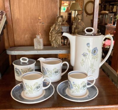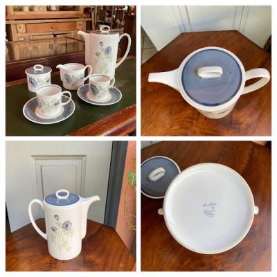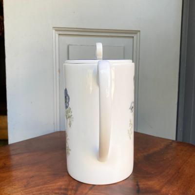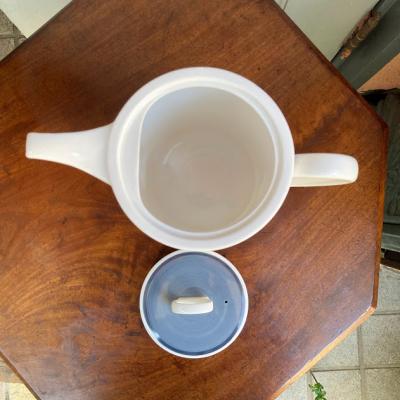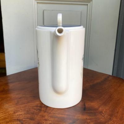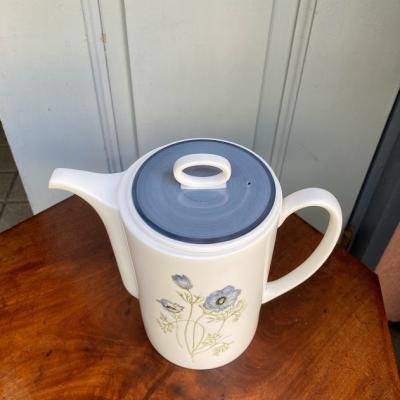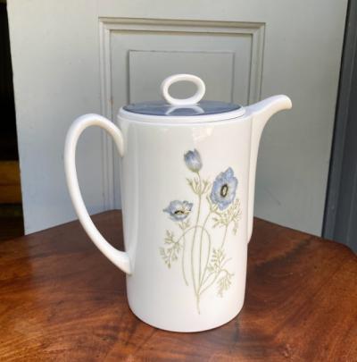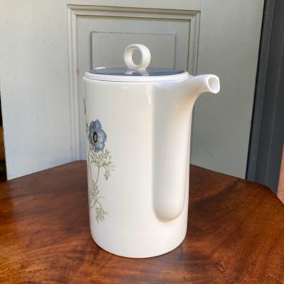 ブルーグレイの色合いが素敵な「グレンミスト」。1951年~1966年スージークーパーチャイナ時代のものです。スコットランドやアイルランドの谷間にの峡谷にできる霧をイメージしてデザインされたそう。当時、スージーの他のデザインは絶賛されていたにもかかわらず、このデザインだけは評価されなかったという一面も持ち合わせていますが、イギリス王室でも購入され1990年まで使用されました。ダイアナ妃もこのシリーズでお茶を楽しまれたとか。何とも感慨深い物語を持つコーヒーポット。福岡市南区の店舗にてお渡しもできますのでお気軽にどうぞ!