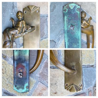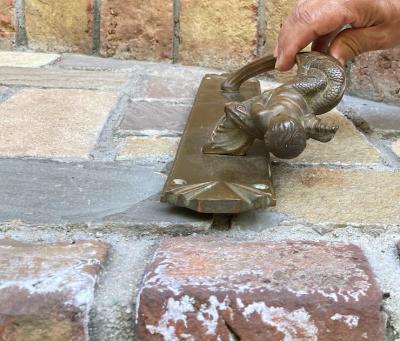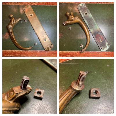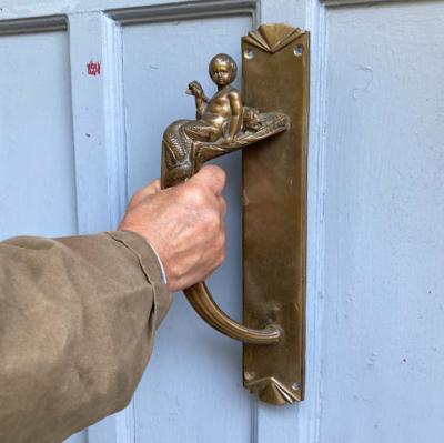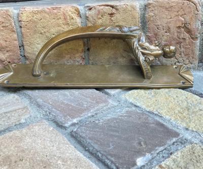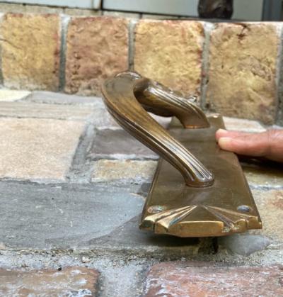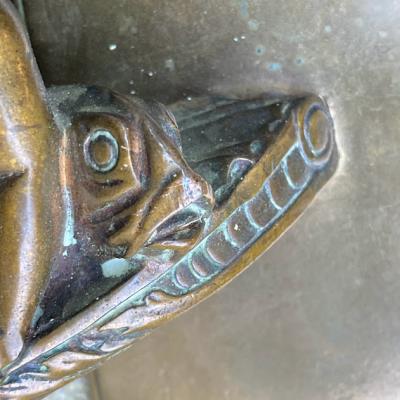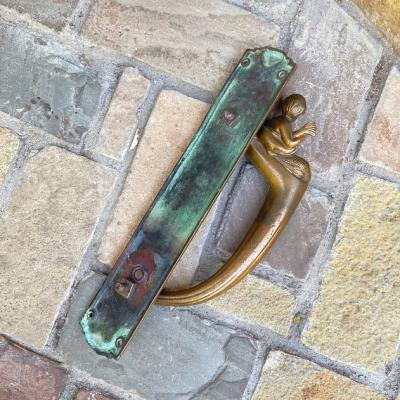 魚のしっぽを持った人魚モチーフの大きなドアハンドル。ハンドル部分が斜めに角度が付いている、かなりインパクトのあるハンドルなので、存在感を出したいドアにおすすめ。手が大きな方でも握りやすいデザインです。裏面は緑青がみられますが、当時のままの雰囲気を残したいのでそのままにしてあります。背面のネジは取り外しができ施工しやすいようになっています。プレートの部分にほんの少しだけゆがみが見られます。取り付けにつきましては、ご自身の契約されている施工業者さまにお問合せください。福岡市南区の店舗にてお渡しもできますのでお気軽にどうぞ!