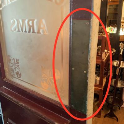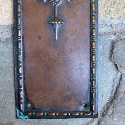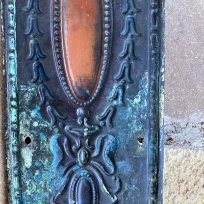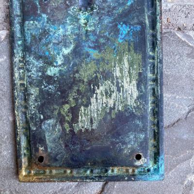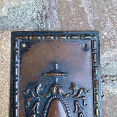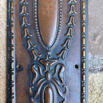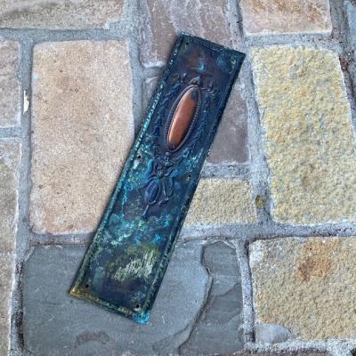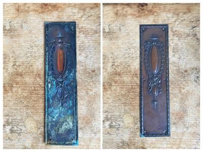 リボンのモチーフが素敵なフランスのドアプレート(フィンガープレート)。1920年代とのこと。レストランなどで片面にはハンドル、裏面にこのようなプレートを取り付けてあることが多いですね。(写真の赤丸参照) 表面には小さな傷、裏面には緑青が見られますが、当時の雰囲気を残すためそのままにしております。ドアや壁面の装飾をお探しの方におすすめ。ピカピカの新品をお求めの方はご遠慮ください。福岡市南区の店舗にてお渡しもできますのでお気軽にどうぞ!