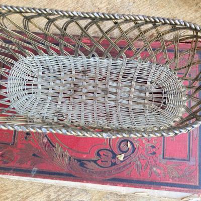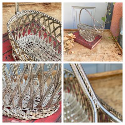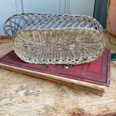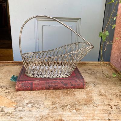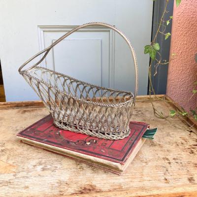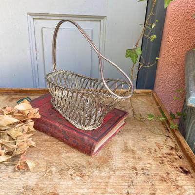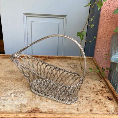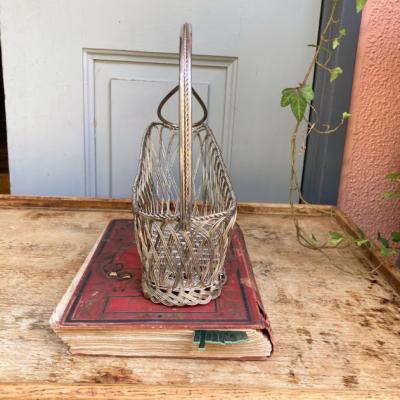 細いシルバープレートのワイヤーを編みこんで作られたワインバスケット。フランス製。ワインをセラーで保存されていた角度にボトルを保つことができる優れもの。流れるような曲線はお部屋を華やかに彩ってくれそうですね。ワイン好きな方はもちろん、便利な持ち手が付いているので、ボトル以外にもカトラリーを入れたり、お花を飾ったりなどアイデアにピンときた方におすすめ。時代を感じる雰囲気を残したいため、軽く拭き上げるのみ行っております。ピカピカの新品をお求めの方はご遠慮ください。福岡市南区の店舗にてお渡しもできますのでお気軽にどうぞ!※撮影に使用した小物は付属しません。