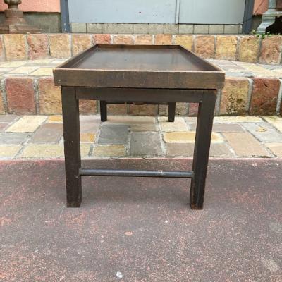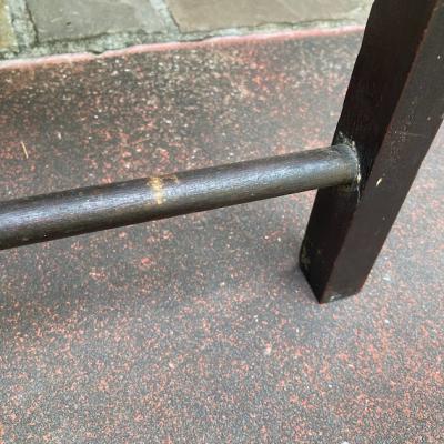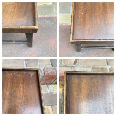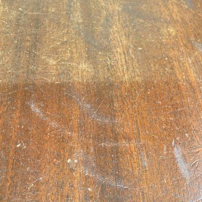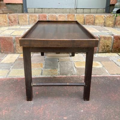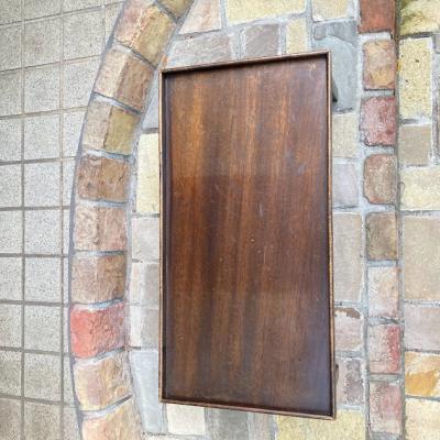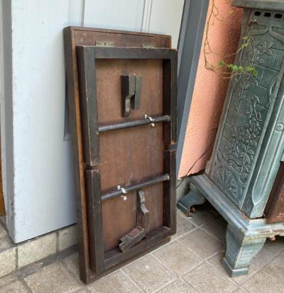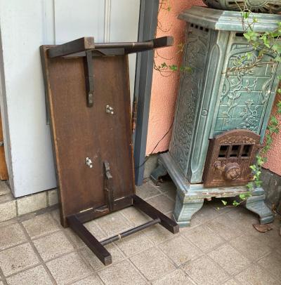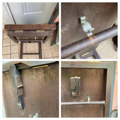 折りたたむと厚さ約6㎝とコンパクトに収納できる小さなローテーブル。裏面のパーツをスライドすることで脚を固定する仕組みになっています。天板部分はマホガニーとのことでした。昔はベッドでお茶を飲む際に使用していたそうです。今では小さなローテーブルや、小さな棚としても活躍しそうですね!落ち着いた雰囲気は和でも洋でも合いそうです。折りたたむ際に固定用の金具にあたるため、その部分の色は剥がれています。スライドして固定する部分は、シンプルな構造になっていますので、ガッチリと固定するというよりは脚が折れ曲がらない程度の強度になります。そのためあまりにも重い物を置くことはおすすめできません。ちょっとしたお茶を楽しみたい方、イベントなどで小さなディスプレイ棚をお探しの方向き。全体的にアンティークらしい風合いがありますので、ピカピカの新品をお求めの方はご遠慮ください。福岡市南区の店舗にてお渡しもできますのでお気軽にどうぞ!