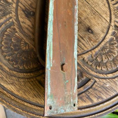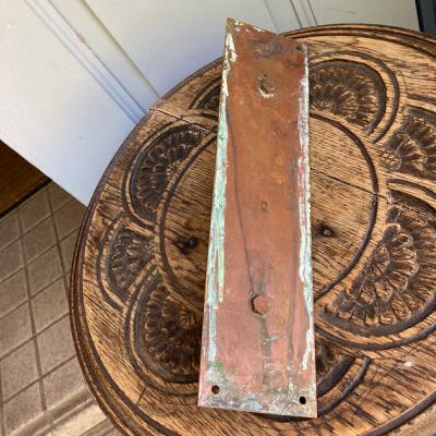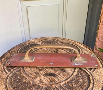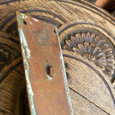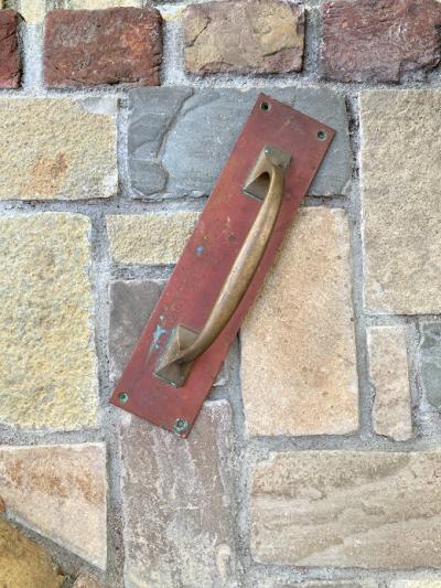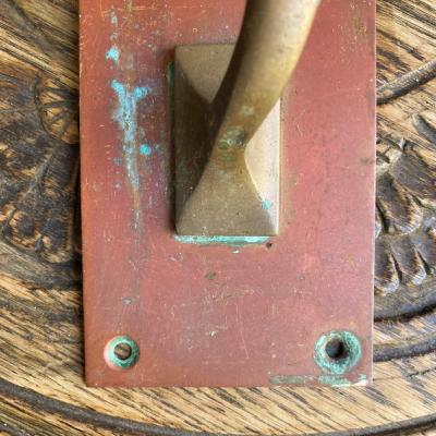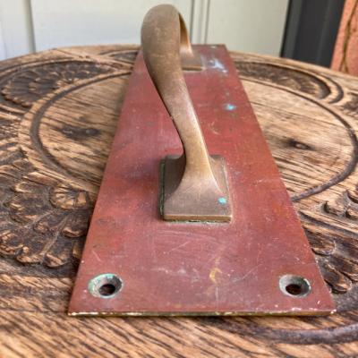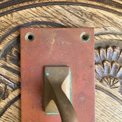 角型ベースのハンドルが入荷しました。きっちりとした印象で暖色系。上下左右4か所には取り付け用の穴(約4mmほど)が開いています。構造上裏面のネジ2か所が約5mmほど出っ張る形となります。取り付けをお考えの方はご自身の契約されている施工業者さまにお問合せくださいませ。雰囲気を残すため薬剤は使用せず乾拭きのみ行っております。表面の緑青も含め時代を感じるたたずまいがお好きな方におすすめ。ピカピカの新品をお求めの方はご遠慮ください。福岡市南区の店舗にてお渡しもできますのでお気軽にどうぞ!