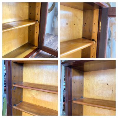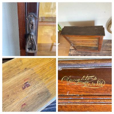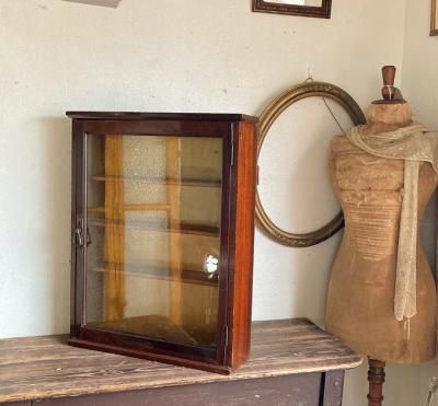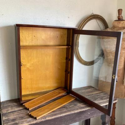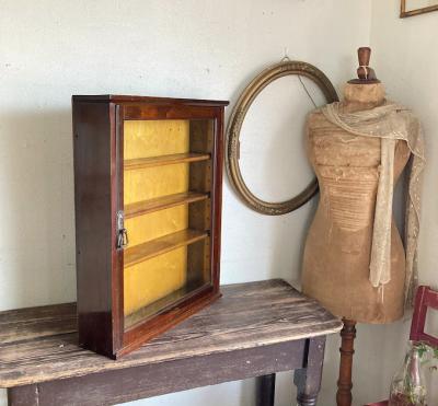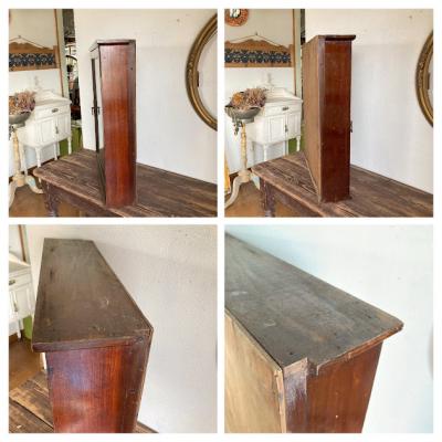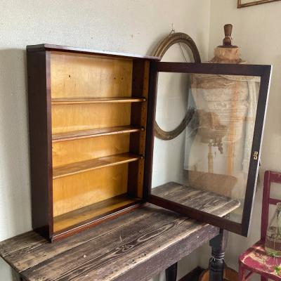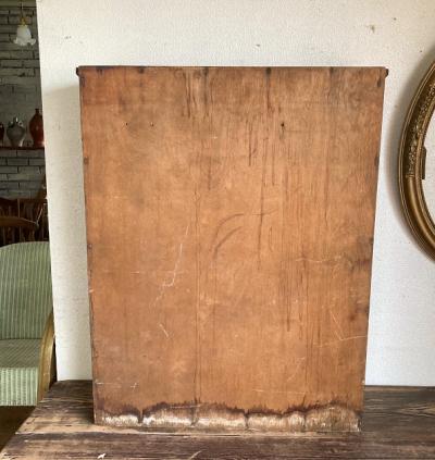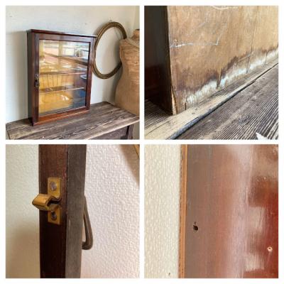 厚さが約15㎝ほどの小さなキャビネット。年代不詳。前面のガラスの扉を大きく開くと、斜めに傾きますので、イギリスでは壁にねじ止めして使用されています。そのため小さなネジ穴が複数開いています。破損を考慮し必ず固定してご利用ください。棚は可動式になっており取り外すこともできました。上部の壁に設置する面の角は、取り付けてあった壁面に合わせて90度にカットされています。前面下に会社のロゴのような金彩が入っています。感じ方に個人差はありますが、扉を開けると香水?芳香剤?のような、外国特有の香りが残っています。裏面下部分には経年による変色部分があります。小ぶりなサイズですので、小物のディスプレイ棚をお探しの方におすすめピカピカの新品をお求めの方はご遠慮ください。福岡市南区の店舗にてお渡しもできますのでお気軽にどうぞ!