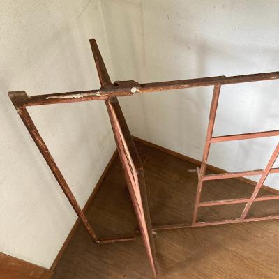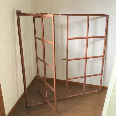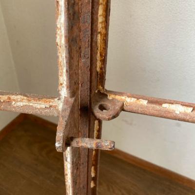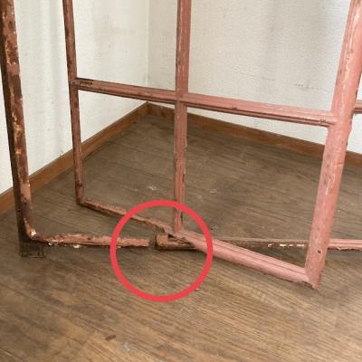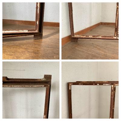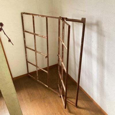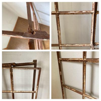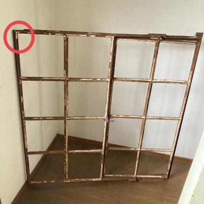 サビ好きさんにはたまらない!赤くサビに包まれた古いアイアンフレーム。真ん中から半分が開閉式になっている珍しいアイテム。ガラスはすべて外されており、ペイントの剥がれも相まって良い雰囲気です。このまま壁に立てかけたり、グリーンとの相性が良いため、アイビーなどを這わせても素敵ですよ。お店などでは商品をディスプレイする什器としても使えます。赤丸で印をつけてありますが、下の横棒に一カ所折れている場所があります。枠などに設置する場合は固定されるためそのままご使用できます。四方にはめ込むための出っ張りもありますが、片方の上部分(赤丸参照)のみありませんでした。このままの佇まいを残すために、ブラシで軽くホコリを払うのみ行っております。サビに包まれた商品となりますので、新しい物よりも古いものに魅力を感じる方におすすめ。ピカピカの新品をお求めの方はご遠慮ください。取り付けにつきましてはご自身の契約されている施工業者さまにお問合せください。福岡市南区の店舗にてお渡しもできますのでお気軽にどうぞ!