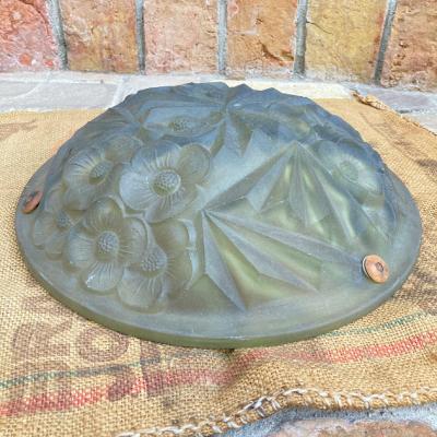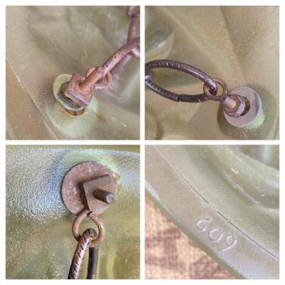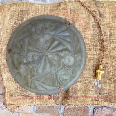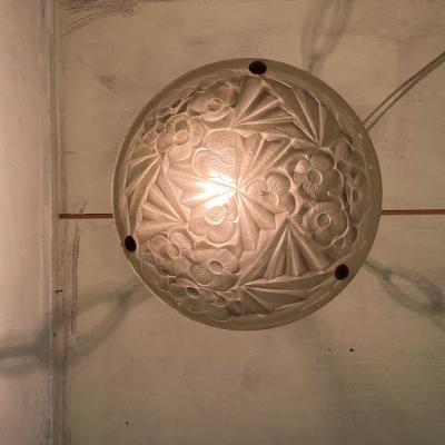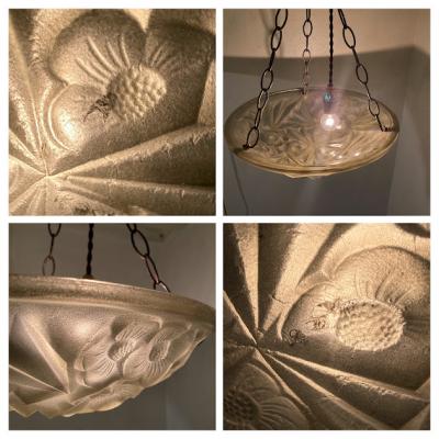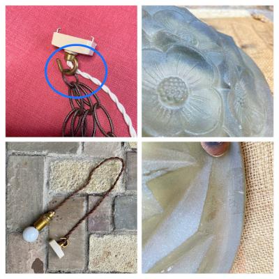 立体的なお花と幾何学模様を組み合わせたアールデコの吊り下げ照明。フランス製。直接光源が目に入らないため、優しくお部屋を包み込みます。可能な限りオリジナルのパーツを使用していますが、ダメージが大きかった内側の留め具部分3カ所のパーツのみ新しい物と交換してあります。(サビがない部分)。フチにある3本のチェーンを引っ掛けシーリングに掛けるだけのシンプルな構造です。電球用のコード、引っ掛けシーリングにつきましては新品を使用。電球は口金サイズ:E17。LED電球にも対応します。古いお品のためガラス内に気泡や、製造時に混入した黒い部分が見られますが、灯りを付けるとガラスの素材感と一体化するため馴染んでしまいます。小さな傷さえも包み込むアンティークの魅力ですね。外側はザラザラと曇りガラスのような感じですが、内側はツルツルです。フチに「609」のように見えるマークが入っていました。雰囲気のある空間を作りたい方におすすめ。福岡市南区の店舗にてお渡しもできますのでお気軽にどうぞ!