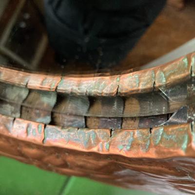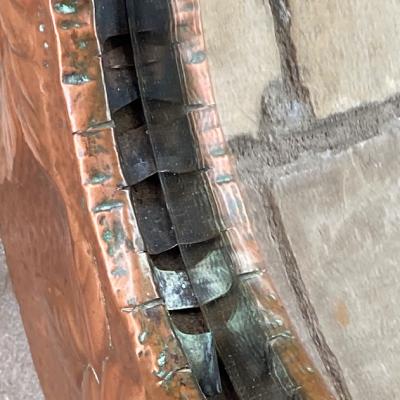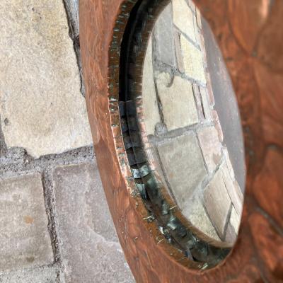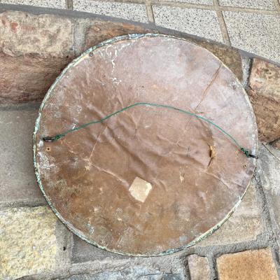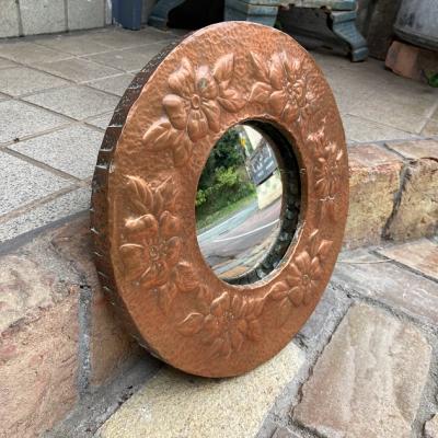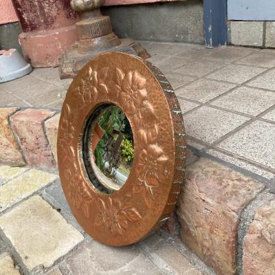 少しずつ銅をたたいて模様を施した立体的な鏡。細やかな凹凸が独特の雰囲気を作り出します。内側にはめ込まれた15cmほどの小さな鏡は、周りの枠で外れない仕組みになっていますが、しっかりと固定されておらず少し動き、表面には小さな傷があります。しっかりとした厚みもあるため、壁面のアクセントとして活躍しそうです。裏面にはワイヤーがはめてあり壁に掛けることができます。インパクトのある鏡をお探しの方におすすめ。ピカピカの新品をお求めの方はご遠慮ください。福岡市南区の店舗にてお渡しもできますのでお気軽にどうぞ!