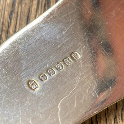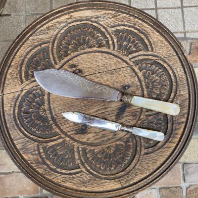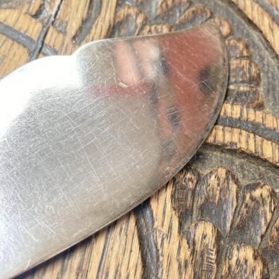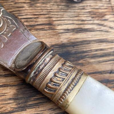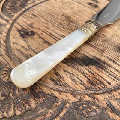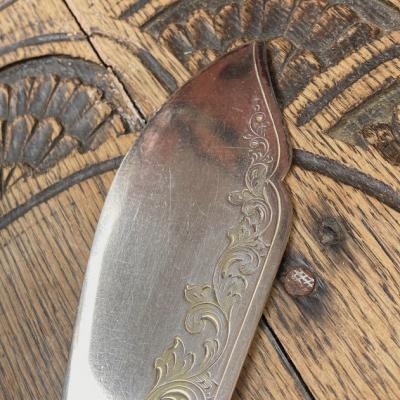 マザーオブパールと呼ばれる天然の貝を使用した大きなサービングナイフ。一般的な大きさのものと比較すると大きさがわかるかと思います。表には植物モチーフの曲線が美しいデザインを施し、裏面にはEPと会社名が刻印が刻まれています。シルバープレートの部分はelectroplated Nickel Silver の略でニッケルや銅などの上に電気を使って銀を施したものです。1842年にバーミンガムのエルキントン社で開発されたこの手法を使うことで安価で美しく丈夫なシルバーアイテムが世界中に広がったものです。細やかな装飾が美しく、毎日の食卓でもご使用いただいてもいいですね。持ち手は天然の貝がベースとなっていますので小さな傷がございます。雰囲気を残すために薬剤でのクリーニングは行わず、軽く拭き上げるのみ行いました。これらも含めてお楽しみいただける方におすすめです。福岡市南区の店舗にてお渡しもできますのでお気軽にどうぞ!