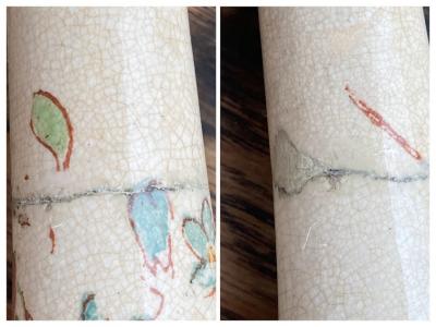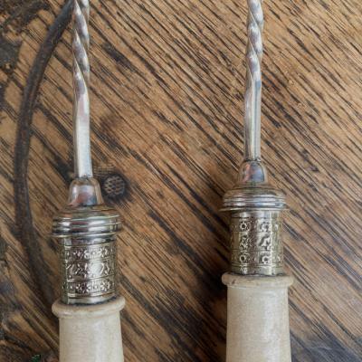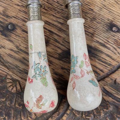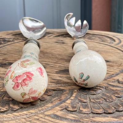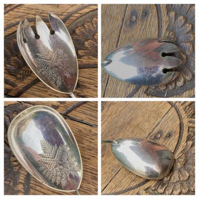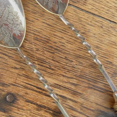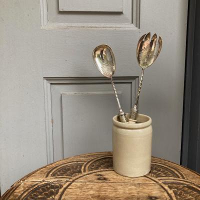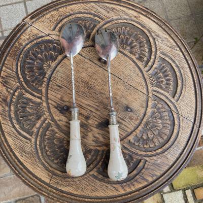 持ち手が陶器で可愛らしい絵柄が施してあるサーバーセット。イギリス、年代不詳。シルバープレートの部分にも細やかな装飾が刻まれており、飾っても楽しめるセットになります。スプーンの持ち手部分には現地で補修した箇所がありましたが、しっかりと固定されているようです。きっと食卓を華やかに彩っていたことでしょう。ハンドルが陶器のためやや重さを感じますが、そのおかげで持ちやすいように感じます。自分だけの特別をお探しの方におすすめ。ピカピカの新品をお求めの方はご遠慮ください。福岡市南区の店舗にてお渡しもできますのでお気軽にどうぞ!