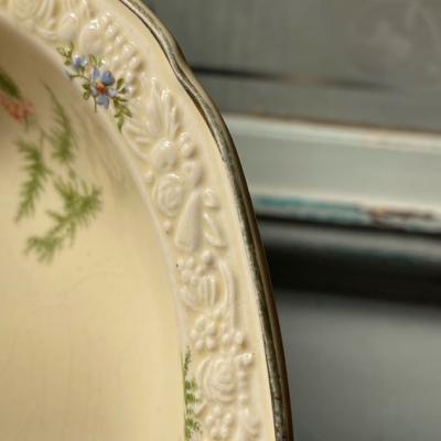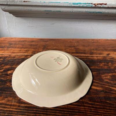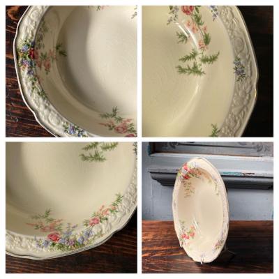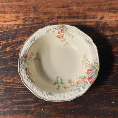 立体的な花柄の装飾とイエローが美しい約19㎝のボウル。イギリス製。推定1930年代。クラウン・デュカル。本場イギリスのアフタヌーンティーのテーブルウエアとしても人気だそうです。フチは18Kで彩られており華やかな印象。製造時に混入した凹凸や金彩の剥がれや貫入などがあります。貫入とは陶器と釉薬の縮みの差による網目状のことで、ヒビとは異なります。長い年月を経た証としてお考えいただければ幸いです。長い時を経た証としてお楽しみいただければと思います。サラダボウル以外にも、花びらを浮かべたり、アクセサリートレイとしても活躍しそうですね。同じ柄、デザイン違いのプレートなども各種あります。福岡市南区の店舗にてお渡しもできますのでお気軽にお問い合わせください!