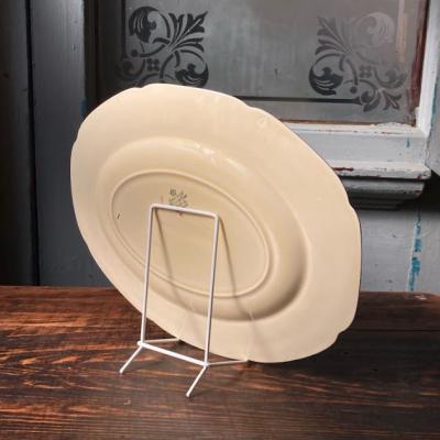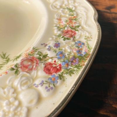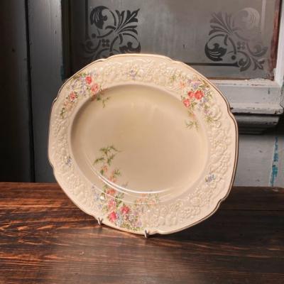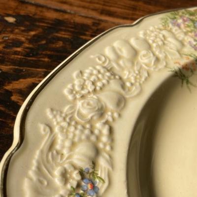立体的な花柄の装飾とイエローが美しい約31㎝ほどの大きめプレート。イギリス製。1930年代。クラウン・デュカル。本場イギリスのアフタヌーンティーのテーブルウエアとしても人気だそうです。フチは18Kで彩られており華やかな印象。製造時に混入した凹凸や金彩の剥がれ、貫入などがあります。貫入とは陶器と釉薬の縮みの差による網目状のことで、ヒビとは異なります。長い時を経た証としてお楽しみいただければと思います。アクセサリートレイとしても活躍しそうですね。このサイズは残り1枚です。福岡市南区の店舗にてお渡しもできますのでお気軽にどうぞ!