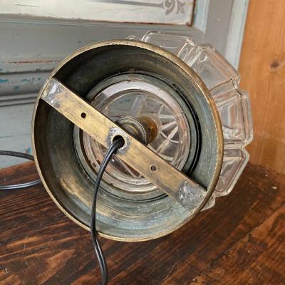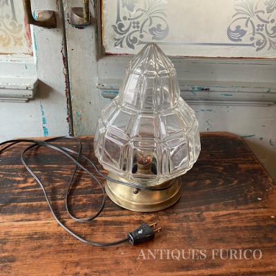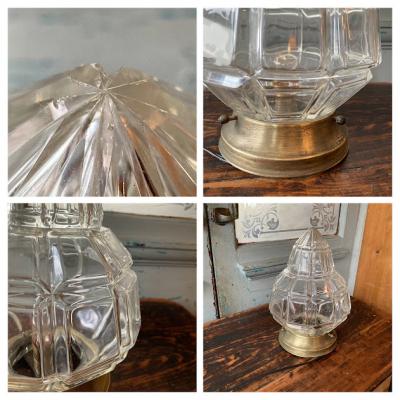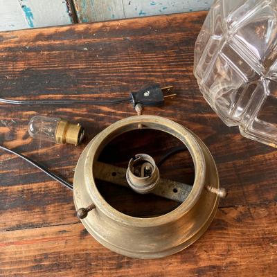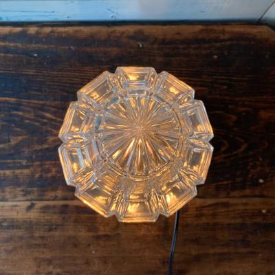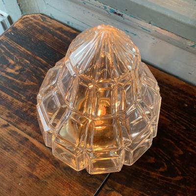 厚みのあるカットガラスに光が反射して、キラキラときらめく天井照明。天井に固定して使用されていたようですが、逆向きに置いても美しく、間接照明としてもいい雰囲気です。撮影の都合上、上下反対で撮影しました。電球は海外仕様のピン式(B22サイズ・撮影時のお試し電球10W使用)です。お好みに応じて明るさを楽しんでください。土台は真鍮で固定用のネジ穴が2か所開いています。真鍮のパーツとガラスシェードがしっかりと固定されていること確認の上取り付けてください。付属のコードは点灯確認用に長めの約230㎝を付属していますが、長さ調整が必要な場合はお気軽にお知らせください。かなり近くで見ると先端に約2mmほどのカケがありますが、少し離れるとほとんどわからないです。お部屋でリラックスする雰囲気の照明をお探しの方におすすめ。ピカピカの新品をお求めの方はご遠慮ください。福岡市南区の店舗にてお渡しもできますのでお気軽にどうぞ!