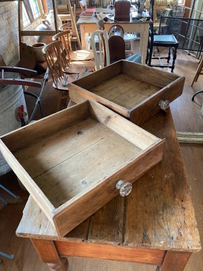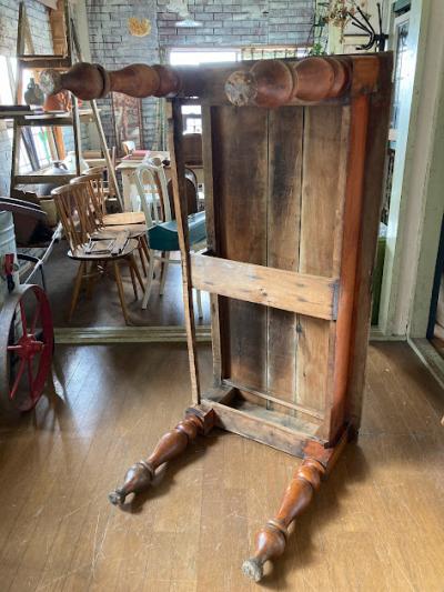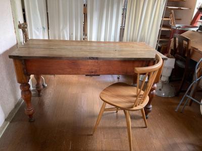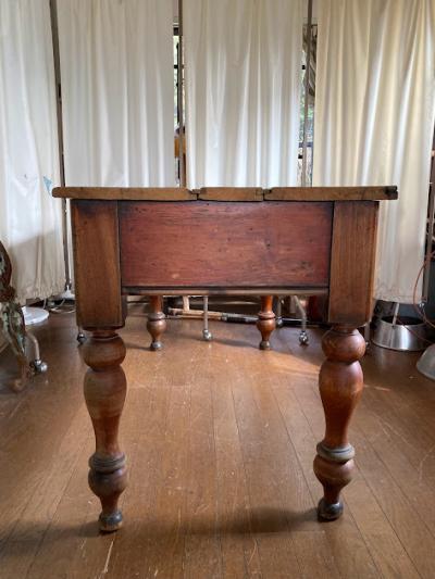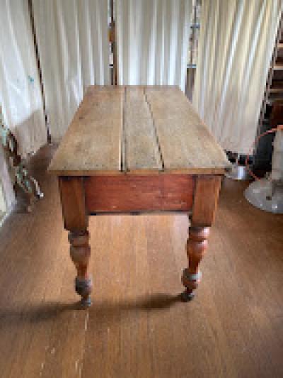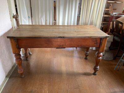 英国より入荷しました。ヴィクトリアン(1837年~1900年代初頭)のダイニングテーブルとして使用されていたとのこと。艶やかな天板は長き渡り使用された歴史を感じる雰囲気。やや低めの高さ約74㎝に引き出しが付いているため、椅子を中に収納することは難しいですが、お店のディスプレイ台や作業台には便利ですよ。天板のオールドパインは、経年により独特の美しい佇まいを見せる素材ですが、経年によりソリが起こる場合があります。そのため赤丸で記しているような手作りの大きなクギでしっかりと固定されています。クギの部分は長い時間を経て丸みを帯びていますのでご安心ください。詳細な画像をお送りすることもできますので、お気軽にお申しつけください。