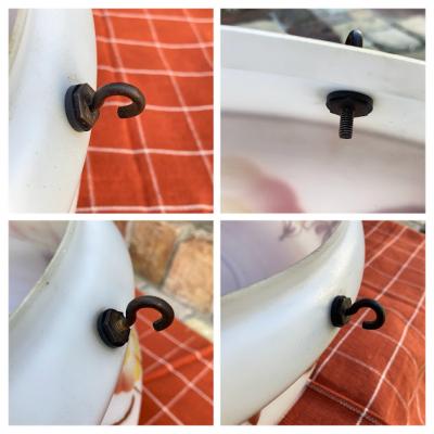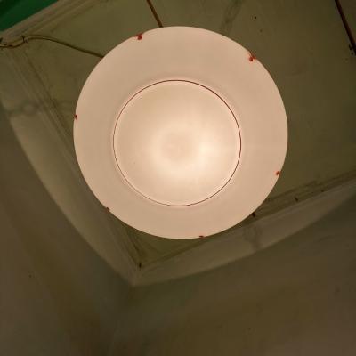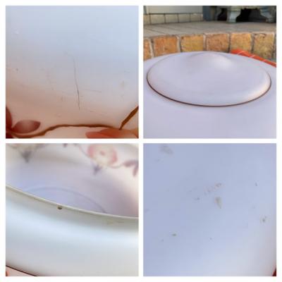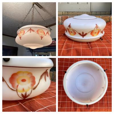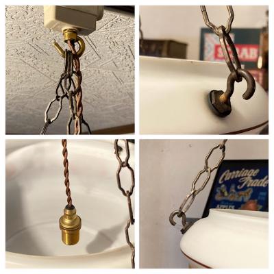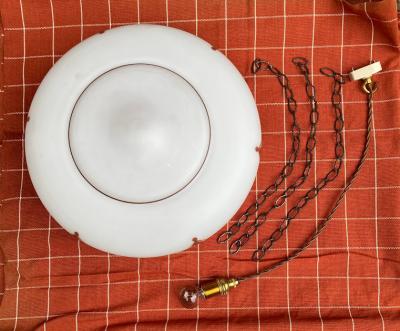 ほんのりとお部屋を照らしてくれる吊り下げ式照明。イギリス製、推定1930年代。光源が直接目に入らないため、リラックスしたい空間の演出にピッタリです。3本のチェーンをフックに掛けるだけのシンプルな構造で、フックの根元に付いていたゴムパッキンは劣化していたため新品と交換済み。電球は口金サイズE17でLED電球にも対応します。撮影時はお試し用電球(白熱球・電球色25W)を使用していますが、お部屋のイメージに合わせてお気に入りの明るさの電球をご利用ください。大きな割れはありませんが、側面に小さな傷や落ちない汚れを含みます。アンティークらしい風合いをお楽しみいただき、レトロな雰囲気がお好きな方におすすめ。ピカピカの新品をお求めの方はご遠慮ください。福岡市南区の店舗にてお渡しもできますのでお気軽にどうぞ!