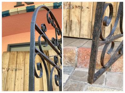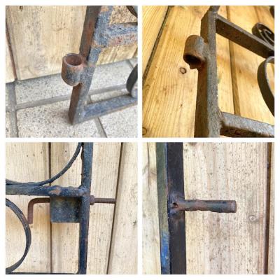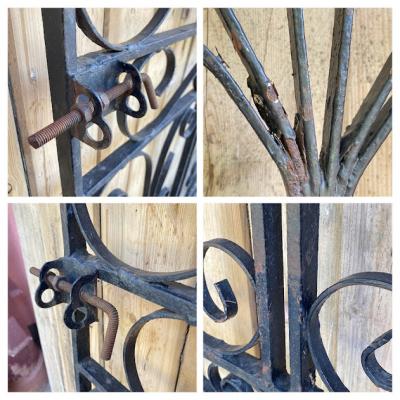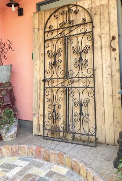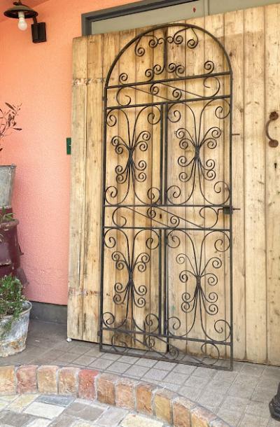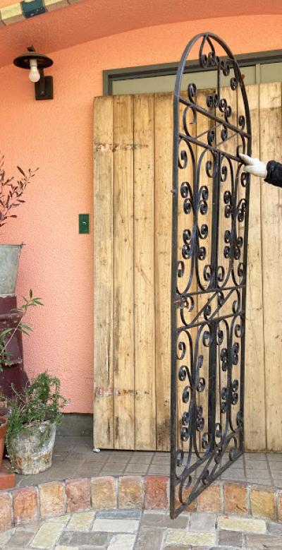 アイアンゲート【42-20-1】アラビアンナイトを思わせる、くるりんと曲がったデザインが素敵ですね。お庭以外でも、立てかけるだけでお部屋の壁面や窓辺のインテリアとして活躍してくれそうです。中央にナットをはめ込んだL字型のパーツが付属していますが、現地のセラーがおまけで付けてくれたようです。サイドには取り付け用の穴が上下2か所あります。(直径φ15mm) 画像に表示しているサイズは取り付けパーツ部分は含まない本体のみのサイズになります。アンティークらしいサビや傷などを含みますが、大きなダメージはありませんでした。取り付けをお考えの方はご自身の契約されている施工業者さまにお問合せくださいね。福岡市南区の店舗にてお渡しもできますのでお気軽にどうぞ!