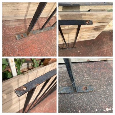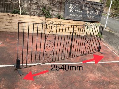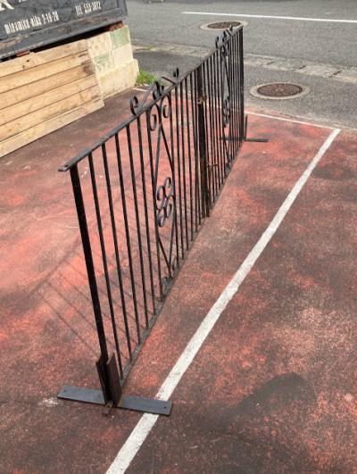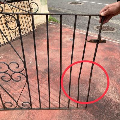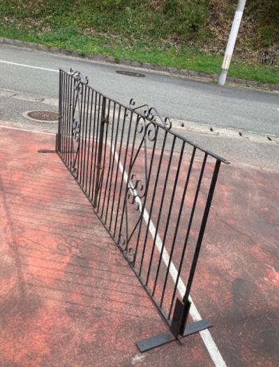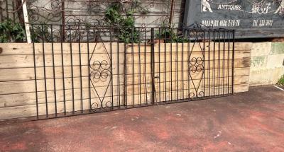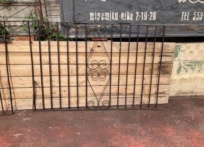 イギリスアンティークの両開きアイアンゲートブラック【42-106】左右には固定用のパーツが上下4か所あり、中央部分には可動式のフックと下に固定するL字型の金具が付属しています。画像に表記したサイズは本体部分のみのサイズとなります。こちらは中央付近にほんの少し凹みがあるため、ペアでお求めやすい価格に設定しております。画像の赤丸部分をご確認ください。お庭のゲートやフェンス、お部屋に立てかけて壁面装飾としても活躍しそうですね。取り付けにつきましては、ご自身の契約されている施工業者さまにお問合せくださいませ。福岡市南区の店舗にてお渡しもできますのでお気軽にどうぞ!