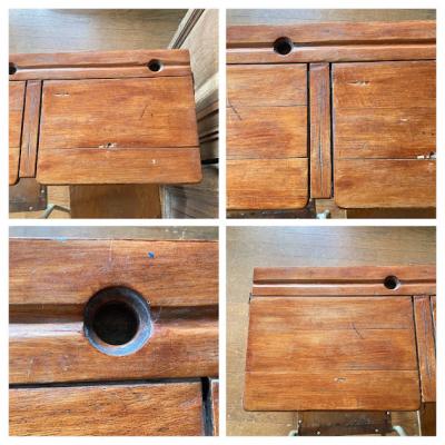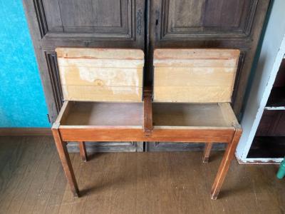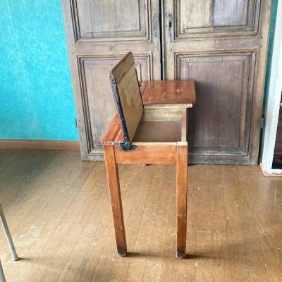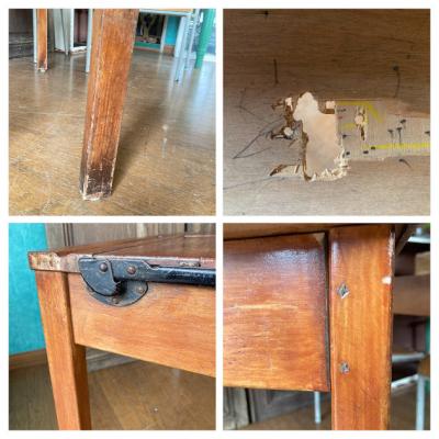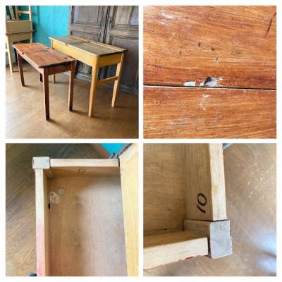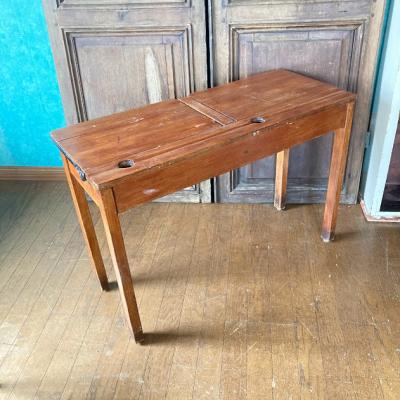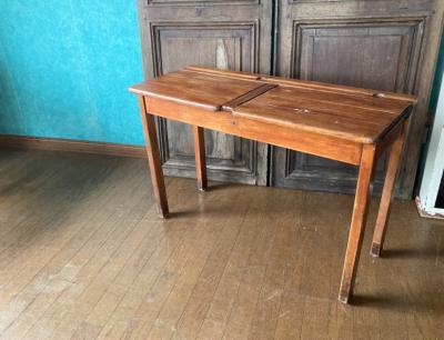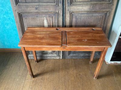 ロンドンの学校で使用されていた低学年用の小さなスクールデスク。推定1950年代とのこと。子供らしい落書きや、授業中に掘ったのかな?と思える凹みが無数にあり、何だかなつかしさを覚えます。机の脚の部分の留め具は、よ~くみると星のように見えるのも可愛らしい物が付いていました。天板にはインク瓶を入れる穴が開いていますが、小さなガラス瓶を入れてお花を飾ったり、ペン立てとしても使えそうです。向かって右側の天板を開けると2㎝ほどの穴が開いています。当時の雰囲気を残すためこのままにしてありますが、簡易的にふさぐこともできますのでお気軽にお申しつけください。撮影に使用した椅子は付属しません。レトロな雰囲気のお部屋作りを楽しんでいる方や、店舗のディスプレイ台をお探しの方におすすめ。福岡市南区の店舗にてお渡しもできますのでお気軽にどうぞ!