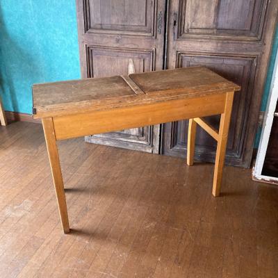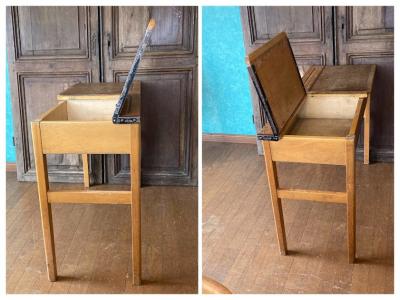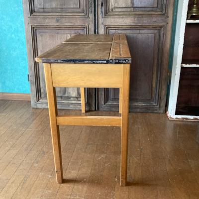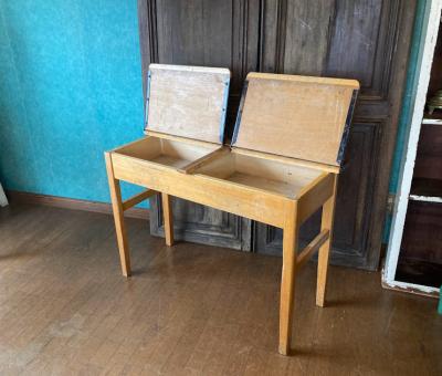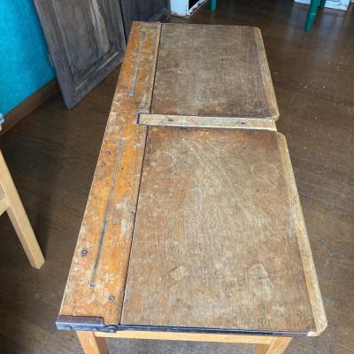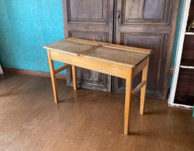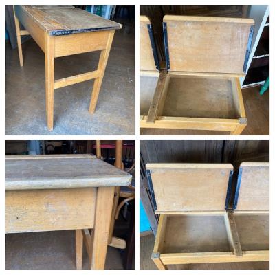 イギリスの学校で使用されていた2人用スクールデスク。推定1950年~60年代。天板の下には収納が付属しています。同じデザインのスクールデスクがありますが、こちらは大人でも使用できる約71㎝ほどの高さになります。雰囲気を残すため乾拭きのみ行っております。リモートワークやハンドメイドの作業台、店舗什器などにおすすめ。ビンテージらしい傷や落書きなどを含みますので、ピカピカの新品をお求めの方はご遠慮ください。福岡市南区の店舗にてお渡しもできますのでお気軽にどうぞ!