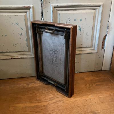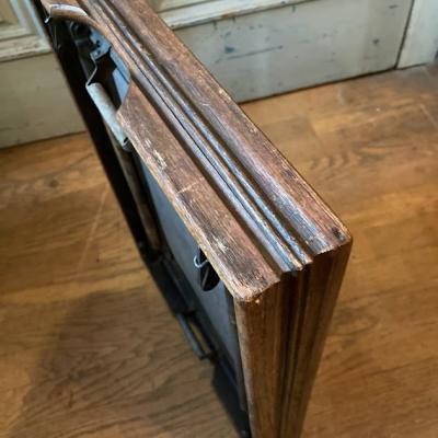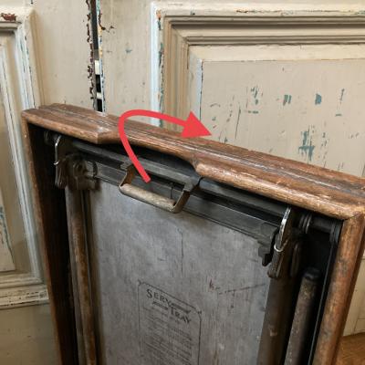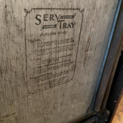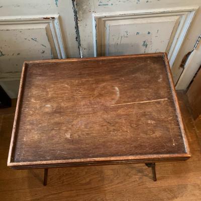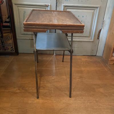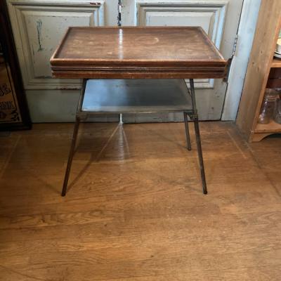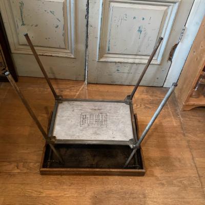 折りたたむとかなり小さく収納できるビンテージテーブル。イギリス製。裏面に説明文が入っています。翻訳アプリなど使用すると読み取ることができます。天板を上にした状態で、左右のハンドルを赤い矢印のようにくるりと動かすと自動的に脚のと棚の部分が下りてきます。一旦脚が伸び切るところまで出した後、天板がグラグラしない高さまでグッと押し下げるようにすると固定されます。ハンドルを回しながら微調整する感じで、何度か練習するとコツが分かりますのてお試しいただければと思います。推定1950年~60年代。ビンテージキャンプのテーブルはお部屋のサイドテーブルなどにちょうど良いサイズ感ですよ。可動式のため安全を考慮し10キロ以上の重たい物は避けてください。表面の傷やサビも含め、独特の風合いをお楽しみいただける方向き。ピカピカの新品をお求めの方はご遠慮ください。福岡市南区の店舗にてお渡しもできますのでお気軽にどうぞ!