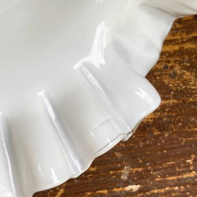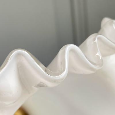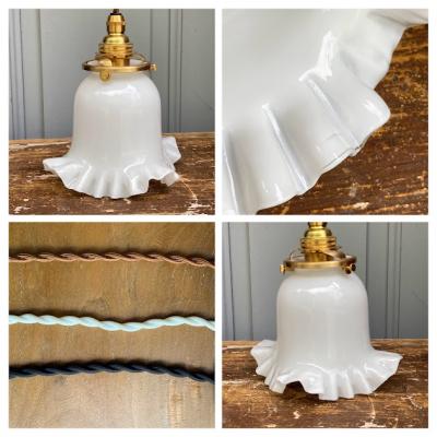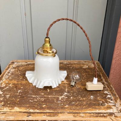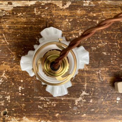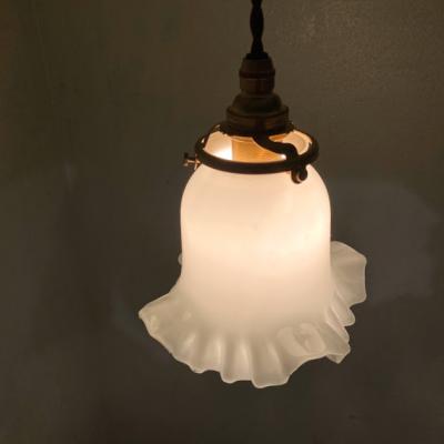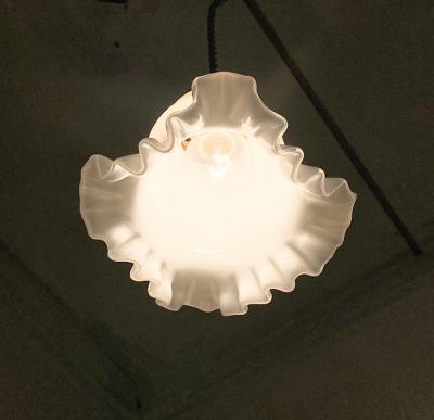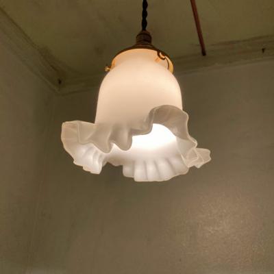ふわりと広がるドレスのようなガラスシェード。イギリス製、推定1940年代。白いガラスに透明なガラスを重ねた構造は電球の光を優しく包み込んでくれます。口金ソケットは新しいものに交換済み、LED電球にも対応します。撮影時は白熱球25W・電球色を使用しているため、ややオレンジ色に見えます。電球の色やワット数によって変わりますので、お好みの明るさの電球をお使いください。フリルの内側に線が入っていますが、製造時にできたもので、割れではありませんのでご安心ください。コードの色、長さはお好きなものと交換できます。コード色、ホワイト・ブラウン・ブラックよりお選びください。長さは1mまでは無料で調整しておりますのでお気兼ねなくお申しつけください。ご要望がない場合は撮影時に使用したコード色:ブラウン、長さ:宅50㎝にてお届けします。福岡市南区の店舗にてお渡しもできますのでお気軽にどうぞ!