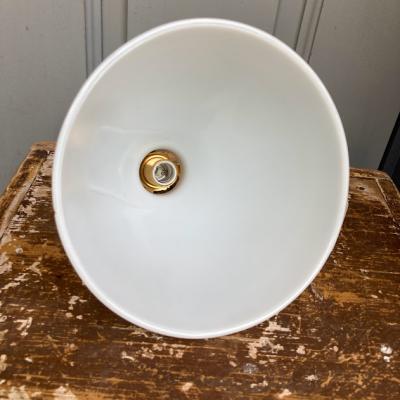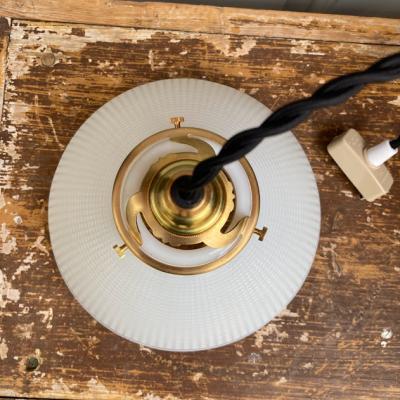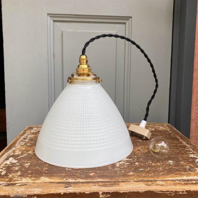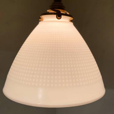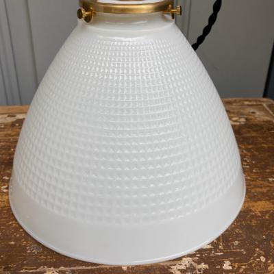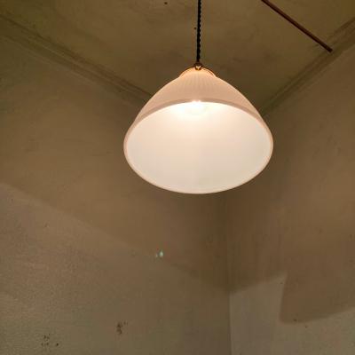表面にワッフルのような模様を施したミッドセンチュリーらしい雰囲気のガラスシェード。内側に「CORNING」のロゴ入り、1950年代とのこと。イギリスより入荷。明かりを灯すと乳白色のガラスがほんのりと色づき優しい空間を演出します。口金は日本仕様の新品に交換済み。口金サイズE17サイズの電球でLED電球にも対応します。コードはホワイト、ブラウン、ブラックの3色から、長さは1mまで無料で調整いたします。撮影時、白熱球(電球色25W)を使用しているためオレンジぽい色合いに見えます。シンプルなデザインなので、カフェやダイニングなど、お客様をおもてなしする空間にもおすすめ。同じデザインの在庫もございますので、お気軽にお問い合わせください。福岡市南区の店舗にてお渡しもできますのでお気軽にどうぞ!
