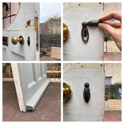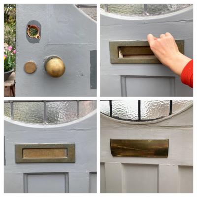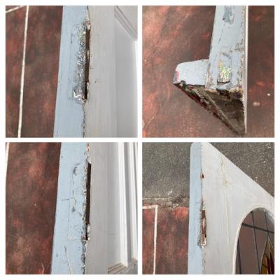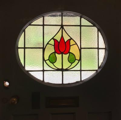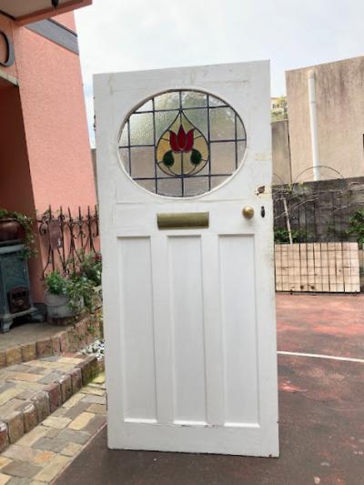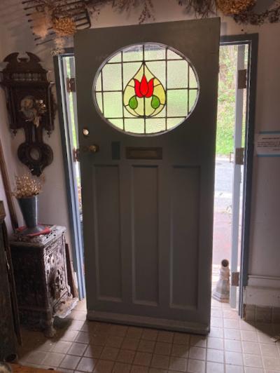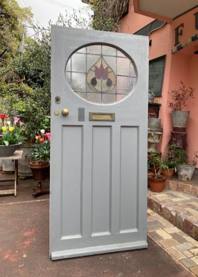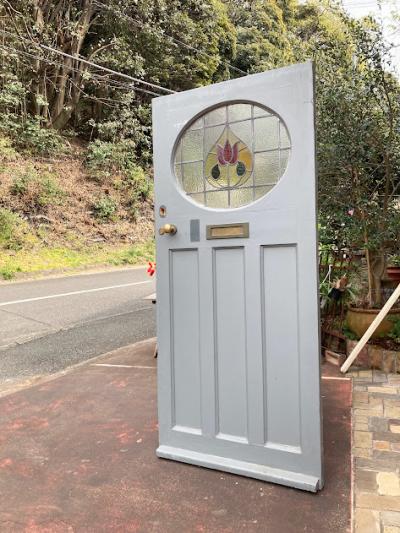 可愛らしいチューリップのステンドガラスをはめ込んだ大きなドア。推定1940年代。楕円形にデザインされた部分のガラスは不透明なガラスを使用しているため、プライバシーも守られ、高さが約212㎝と非常に大きなサイズ感です。小さめのメールボックスと鍵穴などが付いていますが、鍵はかかりませんので交換が必要です。サイドに丁番が取り付けられていた跡が3カ所ありました。ご自身でお好きな色にペイントしても楽しいですね。取り付けをお考えの方は、ご自身の契約されている施工業者さまにお問合せください。小さな傷や凹凸も含めインパクトのある大きなドアをお探しの方におすすめ。ピカピカの新品をお求めの方はご遠慮ください。福岡市南区の店舗にてお渡しもできますのでお気軽にどうぞ!