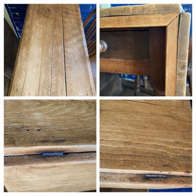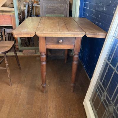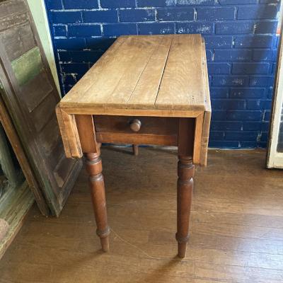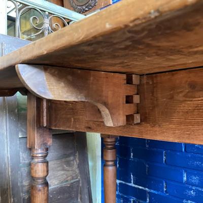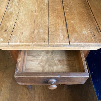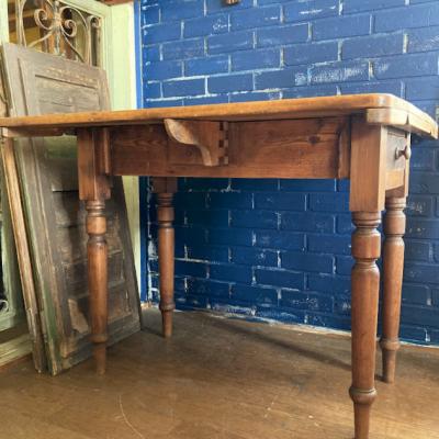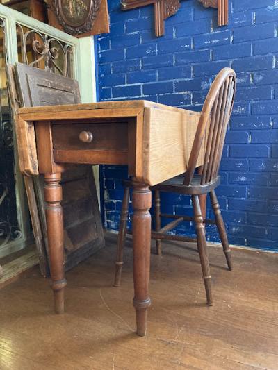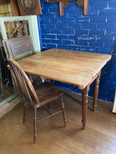 天板下のパーツをスライドするだけで簡単に広げられるオールドパインテーブル。イギリス製、1930年代。長い月日を経て優しく丸みを帯びたテーブルは、ほっと落ち着く雰囲気です。広げたサイズが約90㎝×90㎝とコンパクトなのも嬉しいですね。小さな引き出しも付属。片方だけを折りたたみ壁につけてコンパクトな勉強机や、ワークスペース、ハンドメイドの作業台などさまざまな用途に活躍できそうです。標準的な座面高さ45㎝の椅子も収納できます。天板がテカテカしていませんので、撮影用のベースにもおすすめです。古い家具の時代を感じる雰囲気がお好きな方へ。ピカピカの新品をお求めの方はご遠慮ください。福岡市南区の店舗にてお渡しもできますのでお気軽にどうぞ!※撮影に使用した椅子、小物は付属しません。別途販売。