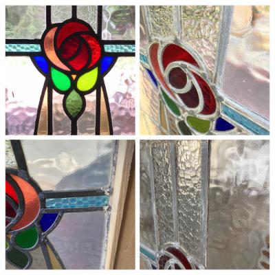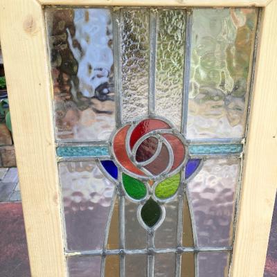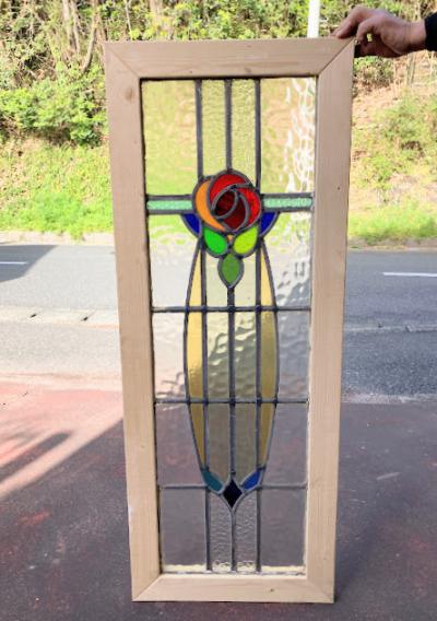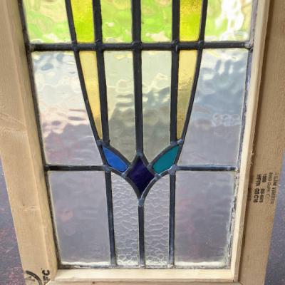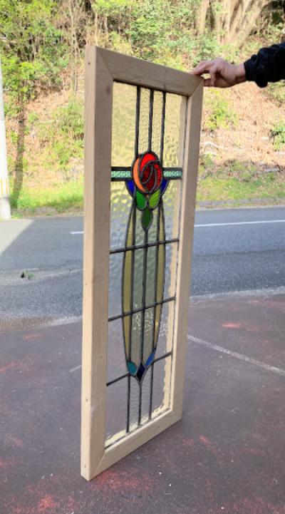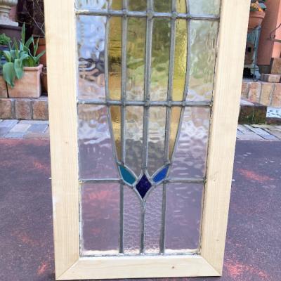 不透明のガラスを組み合わせ、縦長のスッキリとしたシルエットのステンドグラス。推定1930年代、イギリス製。透明に見える部分も、古く凹凸やメラメラするガラスを使用してあるため中のシルエットがはっきりとは見えず、プライバシーも守られ安心ですね。周りの木枠は現地イギリスで新しく作られたものです。塗装はされていませんので、お好きな色にペイントしてお楽しみください。破損を考慮し木枠の取り外しは行っておりません。店舗では明るい窓辺に立てかけております。ドアや壁面への施工をお考えの方は、ご購入前にご自身の契約されている施工業者さまにお問合せください。ガラスに大きな割れなどはありませんが、古いガラスの特徴として気泡、継ぎ目のケイムの部分に経年による色の変化がございます。ピカピカの新品をお求めの方はご遠慮ください。福岡市南区の店舗にてお渡しもできますのでお気軽にどうぞ!