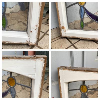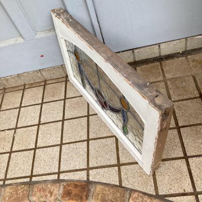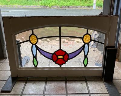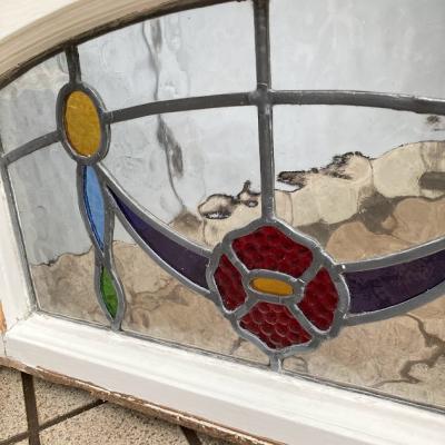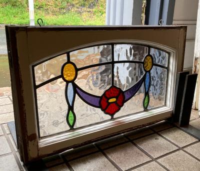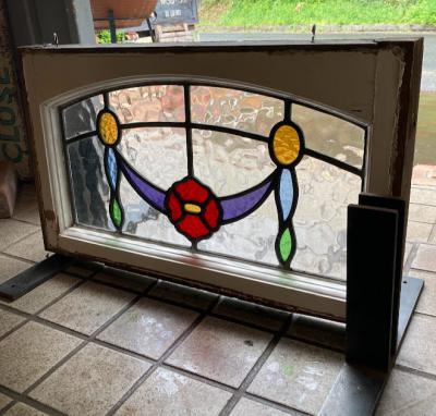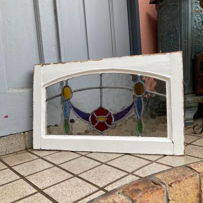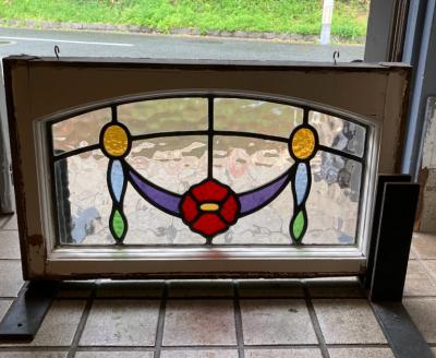アーチを含む柔らかな印象のステンドグラス【42-53-1】推定1940年代、イギリス製。花びらの赤いガラスは丸いプチプチのようなガラスを使い、立体感を感じます。透明に見える部分も凹凸のあるガラスを使用してあるため、ゆらゆらした感じに見えます。古いガラスを使用していますので全体に小さな気泡や小さな傷を含みます。このまま窓辺に立てかけたり、店でははてなフックを使い窓枠に吊るして展示を行っています。ぜひ太陽光の当たる場所でお楽しみください。時間帯によって見える印象が違って素敵ですよ。破損を考慮し木枠の取り外しは行っておりません。ドアや壁面に取り付けをお考えの方は、事前にご自身の契約されている施工業者さまにお問合せください。同じ柄が2枚ありますのでペアで使ってもいいですね。撮影に使用したステンド立ては付属しません。当店のオリジナルとなりますので、ホームページでご確認をお願いします。福岡市南区の店舗にてお渡しもできますのでお気軽にどうぞ!