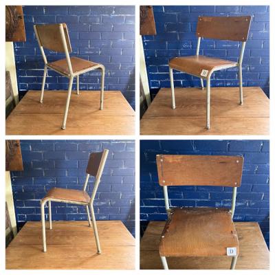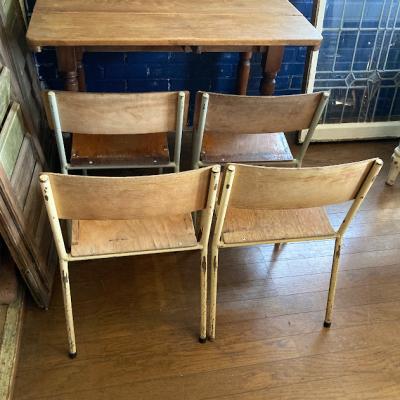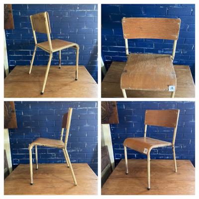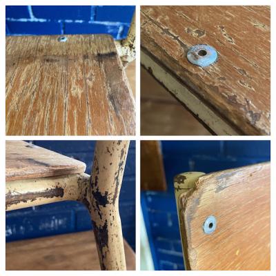 シャビ―な雰囲気が素敵で座面の高さが約36㎝の愛らしいキッズチェア。4脚入荷しました。1脚ずつのばら売りです。ご購入の際にご希望の椅子をお知らせください。本体価格&送料は1脚あたりのお値段を表示。A/Bはフレームがややクリームがかった色、C/Dはライトグレーにペイントされています。1950年代のビンテージ。ケガをしないように丸みを帯びたネジを使用してあります。4つ重ねてすっきり収納できるようになっています。大人が楽しむ椅子として、毎日のバッグの定位置や、ディスプレイ台、花台、玄関で靴をはくサポート台としても程よいサイズ感ですよ。まとめて購入される場合は送料が変わりますのでお知らせください。LINEやメールで個別の画像をお送りすることもできますので、お気軽にお申しつけください!