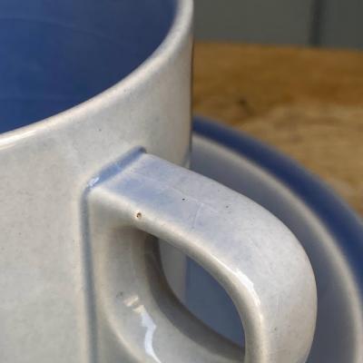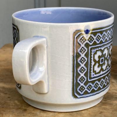 使い勝手のよいイギリスのHORNSEAの「TAPESTRY(タペストリー)」カップ&ソーサーが入荷しました。1970年~80年代。モザイクのような模様が落ち着いたトーンで描かれています。水色をベースにカップの内側やソーサーのフチの部分が、ほんのり濃い青になっておりグラデーションが美しいカップです。大きな割れなどはありませんでしたが、ソーサーの内側や側面にうっすらと貫入が見られます。貫入とは陶器と釉薬の縮みの差による網目状のことで、ヒビとは異なります。長い年月を経た証としてお考えいただければ幸いです。持ち手の近くに製造時にできた釉薬の丸い模様が1か所あります。毎日のお茶の時間をお気に入りのカップと共に過ごしてみたい方におすすめ。ピカピカの新品をお求めの方はご遠慮ください。福岡市南区の店舗にてお渡しもできますのでお気軽にどうぞ!