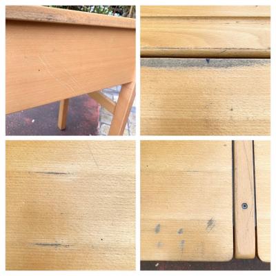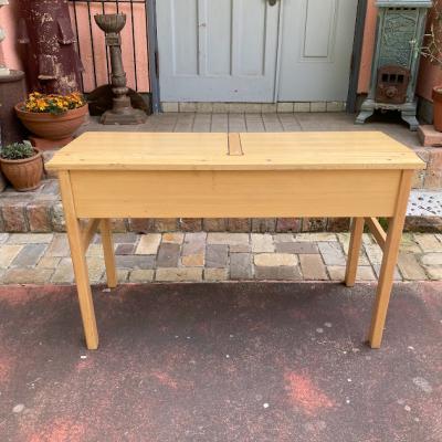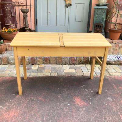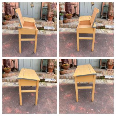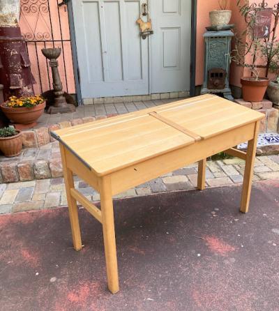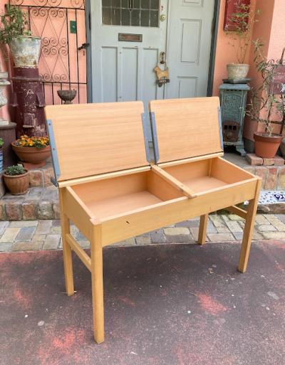 今回現地セラーの協力により、お求めやすい商品が入荷しました!推定1970年~80代のビンテージスクールデスク(W)です。英国の学校で使用されていたもので、比較的新しい商品となります。天板には横向きにペンを置くための溝が彫られおり、天板を上に開くと教科書などを収納できるスペースが一人分ずつ分けて付属。収納庫内の左右の端に穴が開いています。長時間の学習でも疲れにくいように、天板はやや斜めに設計されています。学習机以外にも読書やハンドメイドの収納を兼ねた作業台、お手頃な価格の店舗用のディスプレイ台をお探しの方におすすめ。ビンテージ品らしく小さな傷などを含みます。ピカピカの新品をお求めの方はご遠慮ください。福岡市南区の店舗にてお渡しもできますのでお気軽にどうぞ!撮影に使用した椅子は付属しません。