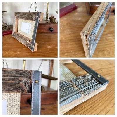 今回はアイアン×バーンウッドを組み合わせ、オリジナルの空間を楽しむフレームとなります。裏の写真を固定する金具もあえて軽く曲げることで、しっかりと固定でき、真鍮色のマイナスネジもアクセントになっています。ガラス横の空間はお好きなサイズに移動できますので、ご自身の一番しっくりくる場所で固定してください。縦でも横でも使用できますが、デザインによってはいずれか固定になる場合があります。写真は店舗で(仮)で入れていますので、お好みの写真やイラストなどをご使用くださいね。すべてのフレームは少しずつデザインが違いますので、組み合わせても素敵ですよ。価格は1枚あたりの価格となります。福岡市南区の店舗にてお渡しもできますのでお気軽にどうぞ!