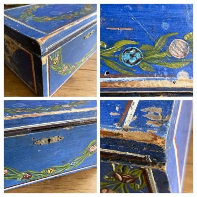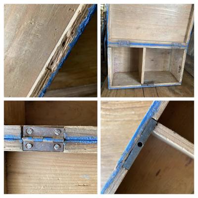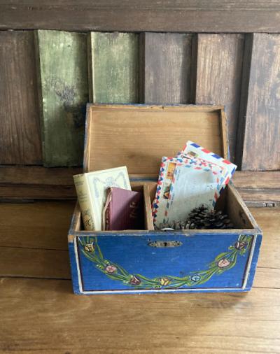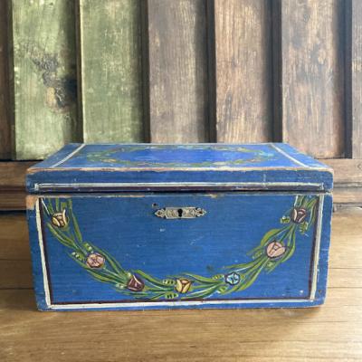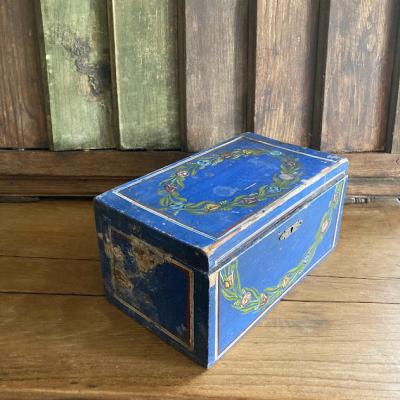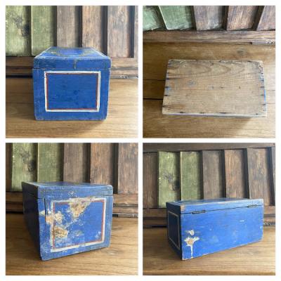 鮮やかなブルーにペイントされた手書きの木製ボックス。素朴な花柄にほっと癒されるデザインです。イギリス製、年代不詳。箱の中は仕切りで区切られていますが、均等ではありません。アクセサリーやハンドメイドのパーツ、お薬箱やメイクボックスなど、お気に入りの定位置としてお楽しみくださいね。鍵穴はありますが鍵はかかりません。蓋の部分のパーツは外れていますので飾りとしてお考えください。レトロな雰囲気の木箱をお探しの方、店舗のディスプレイ什器をお探しの方におすすめ。ピカピカの新品をお求めの方はご遠慮ください。福岡市南区の店舗にてお渡しもできますのでお気軽にどうぞ!