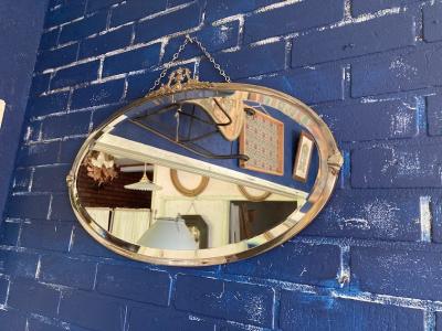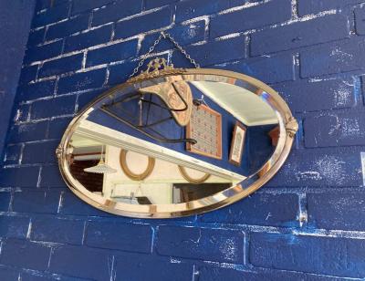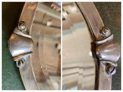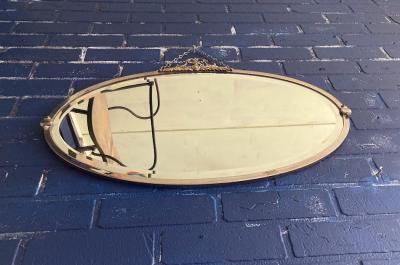 横長の楕円形ミラー【42-84】が入荷しました。イギリス製、1940年代とのこと。鏡のフチは斜めにカットされており立体感を感じます。周りのフレームも繊細なデザインを施してあり、華やかな印象に。後ろに付属しているチェーンと、フチのネジ1個は現地で新しい物と交換されているようですが、馴染んでいるため目立ちません。鏡の表面、フレームや裏面にはうっすらと傷や凹みがございます。長く月日を過ごしてきた証ですので、これらも含めてお楽しみいただける方におすすめ。ピカピカの新品をお求めの方はご遠慮ください。福岡市南区の店舗にてお渡しもできますのでお気軽にどうぞ!