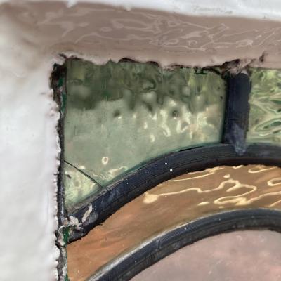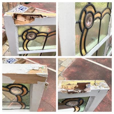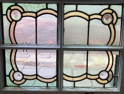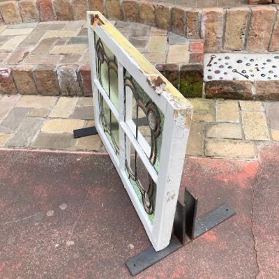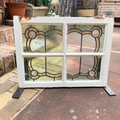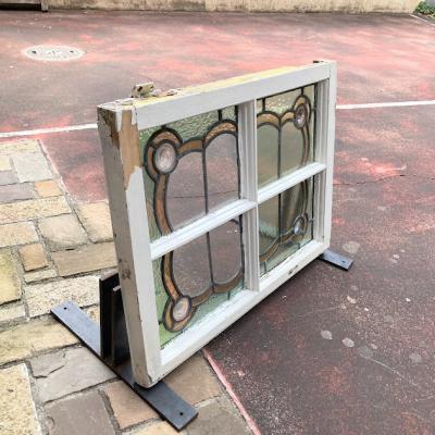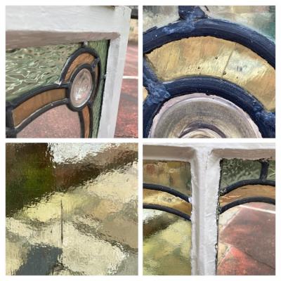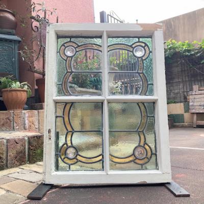 左右に色合いの違うガラスをはめ込んだステンドガラス【41-128】イギリス製、1940年代。4つの丸いロンデルガラス(吹きガラス)も可愛らしいアクセントになっています。片方は中央部分がクリアに、もう片方は不透明なガラスを使用。横向きに取りつけられていたようですが、縦でも使えそうなデザインです。ガラスには古いガラス特有の気泡や製造時できた小さな凹凸を含みます。木枠部分には丁番が2か所取り付けられていたようですが、一つは破損、片方は木枠ごと外れていますので、取り付けを行う際には新しいものと交換が必要です。優しい色合いのガラスですので、そのまま窓辺に立てかけてもお部屋の印象が変わって素敵ですよ。不透明なガラスの方に1㎝ほどの小さな割れがありますので、こちらは補修してお渡しとなります。(拡大画像をご覧ください)窓や壁面に取り付けをお考えの方は、ご自身の契約されている施工業者さまにお問合せください。福岡市南区の店舗にてお渡しもできますのでお気軽にどうぞ!