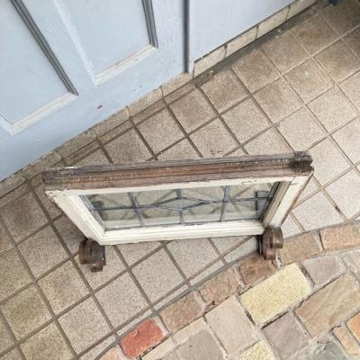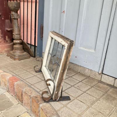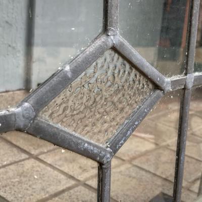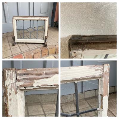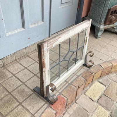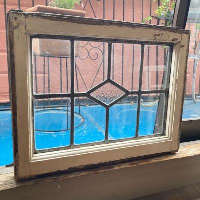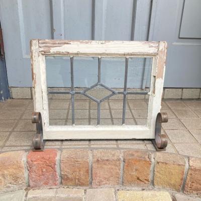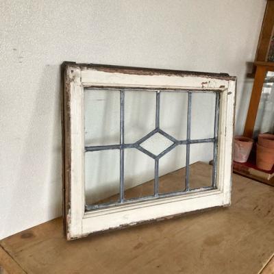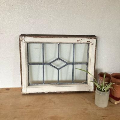 約50㎝×40㎝の小さめのカラーレスガラス【42-115】イギリス製、推定1940年代とのこと。中央のひし形部分だけが、立体感のあるガラスを使ってあります。木枠の側面にはぐるっと溝が入っているので、スライド式の場所に使われていたようです。このままお部屋に立てかけたり、お庭のガーデンシェッド(物置小屋)の小窓などに素敵ですね。ガラスに大きな割れなどはありません。木枠のペイントは経年による剥がれを含みます。レトロな雰囲気がお好きな方におすすめ。ピカピカの新品をお求めの方はご遠慮ください。福岡市南区の店舗にてお渡しもできますのでお気軽にどうぞ!