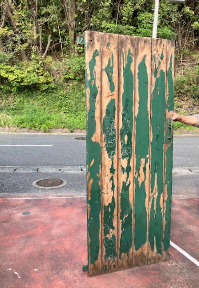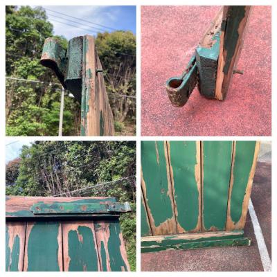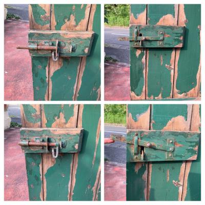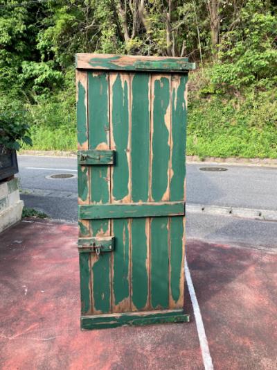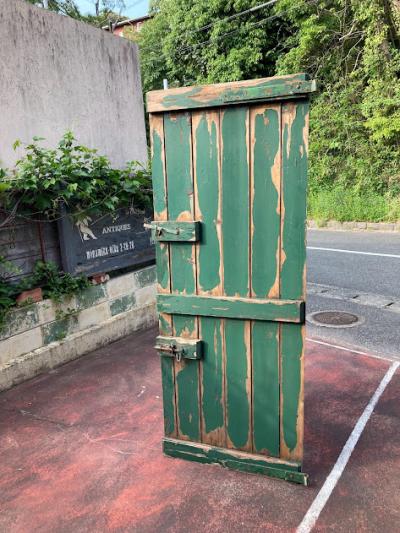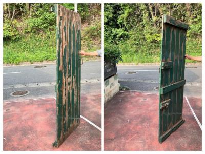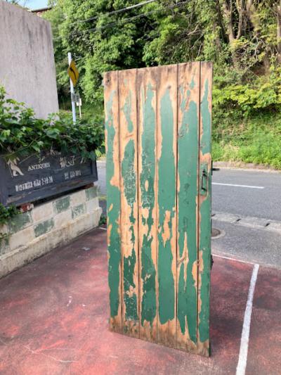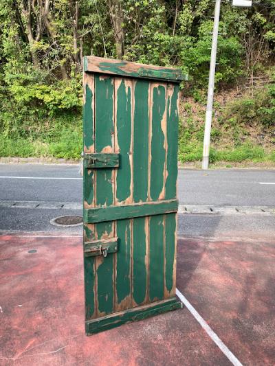 納屋などで使用され独特の雰囲気を持つ木製ドア。1940年代、イギリス製。現地では何度もペイントを重ねたり、修理をくり返しながら室内のドアや作業小屋(ガーデンシェッド)で使うそうです。あえてシンプルな壁面にこのような存在感のあるドアがあっても面白いですね。表面の緑のペンキはポロポロと剥がれ落ちる部分のみ取り除いてありますが、時間の経過に伴い違う表情を見せてくれます。上からお好きな色を塗ってもいいですね。中央に上下に可動するパーツ、下の方にはかんぬきが付属。側面に丁番の代わりになるようなパーツが上下2か所あります。取り付け箇所に応じて調整ください。お店などではこのまま立てかけて、壁面のディスプレイスペースとしても活躍しそうです。現状のお渡しとなりますので、個性的なドアをお探しの方におすすめ。取り付けにつきましてはご自身の契約している工務店様にご相談の上ご購入ください。福岡市南区の店舗にてお渡しもできますのでお気軽にどうぞ!