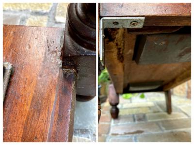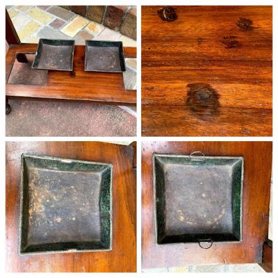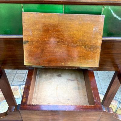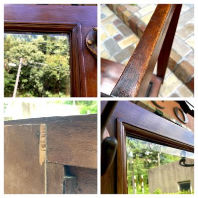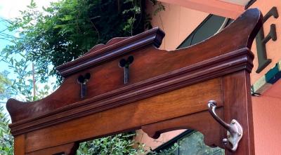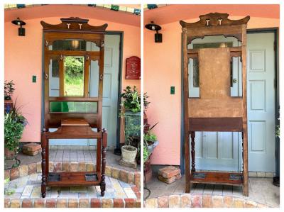 紳士淑女のイギリスならではの家具であるホールハンガー。重厚感のあるダブルフックが6個付属、昔はステッキスタンドとして活躍していた左右のスペースは傘立てとして。下には水受けもあり取り外しもできるのでメンテナンスも簡単です。中央には靴ブラシ入れとして作られた蓋つき収納があり、玄関で鍵や印鑑などを収納するのにとても便利ですね。蓋の開閉はスムーズでした。横から見るとすっきりとした印象です。推定1930年代のマホガニーで作られたもの。中央の鏡の隅にはほんの少しアンティーク独特の黒い汚れがあります。長い時代を経た風合いとして見ていただければと思います。正面から右手前の脚の裏側部分は、英国にて金具を取り付けた跡、部分的に修復の跡がございました。中央の緑のタイル部分はうっすらと貫入がございます。古いお品のため小さな傷や凹凸、経年劣化により現れたシミのようなものはございます。これらも含めてお楽しみいただける方におすすめ。かなり高さがあるためお届けの際には、上の飾り部分を外してお届けいたします。(取り外すパーツの写真にコメントを入れてあります。)取り付けは差し込むだけで難しくはありませんのでご安心ください。福岡市南区の店舗にてお渡しもできますのでお気軽にどうぞ!