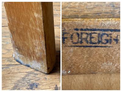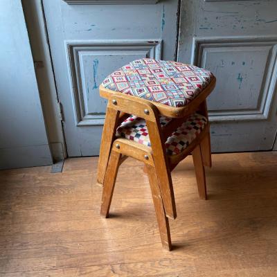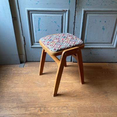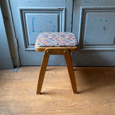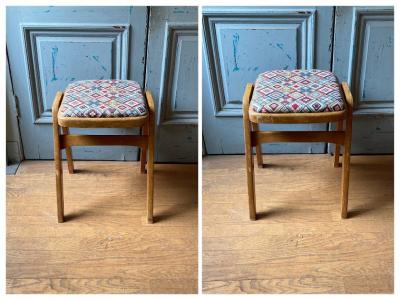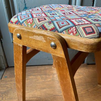 重ねられるイギリスのビンテージスツール【41-37-1】(ダイヤ柄)座面の部分はダメージが大きかったので、中のクッション含めイギリスの厚手の生地に張替えメンテナンス済みです。木製の部分には年月を経た証としてビンテージらしい傷や剥がれを含む風合いはありますが、鮮やかな座面とのコントラストが素敵なスツールに生まれ変わりました。裏面に、「FOREIGN」のロゴがスタンプされているので海外輸出用の商品のようです。推定1950年代。キッチンや玄関先でちょっと腰掛けたい時に一つあると便利ですね。ピカピカの新品をお求めの方はご遠慮ください。福岡市南区の店舗にてお渡しもできますのでお気軽にどうぞ!