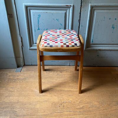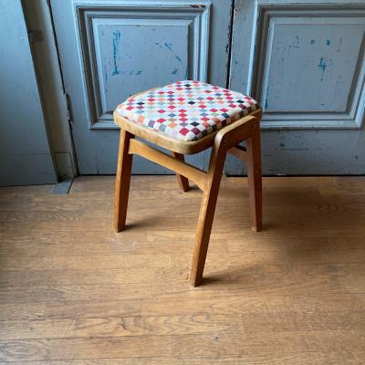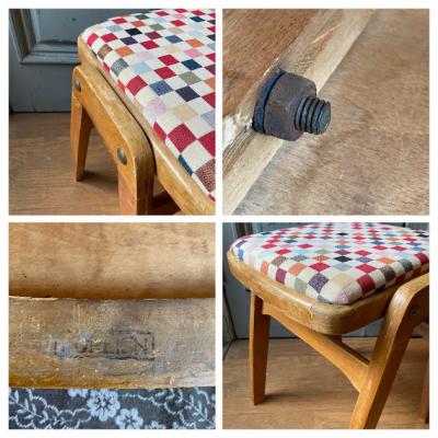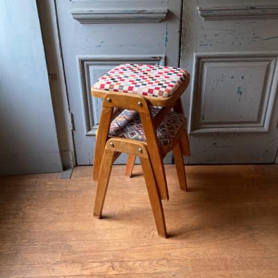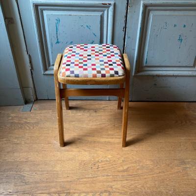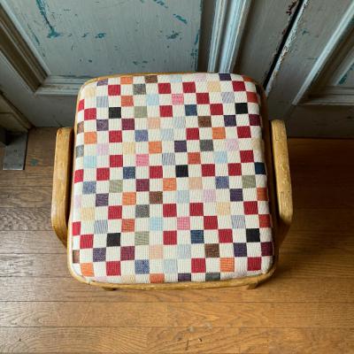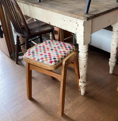 重ねられるイギリスのビンテージスツール【41-37-1】(スクエア柄)座面の部分はダメージが大きかったので、中のクッション含めイギリスの厚手の生地に張替えメンテナンス済みです。木製の部分には年月を経た証としてビンテージらしい傷や剥がれを含む風合いはありますが、鮮やかな座面とのコントラストが素敵なスツールに生まれ変わりました。裏面に消えかけていますが、「FOREIGN」のロゴがスタンプされているので海外輸出用の商品のようです。推定1950年代。キッチンや玄関先でちょっと腰掛けたい時に一つあると便利ですね。ピカピカの新品をお求めの方はご遠慮ください。福岡市南区の店舗にてお渡しもできますのでお気軽にどうぞ!
