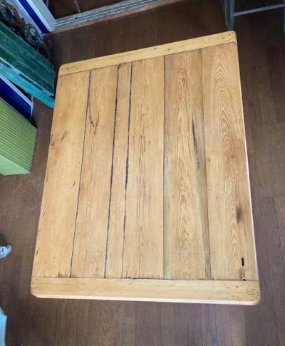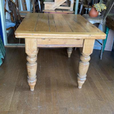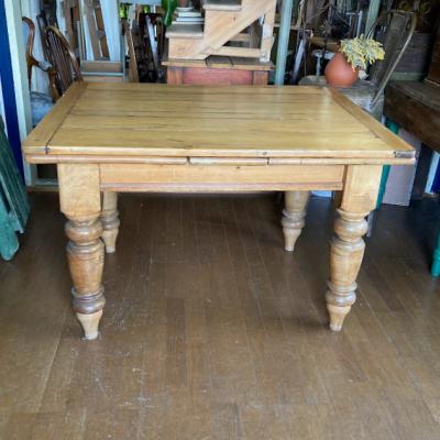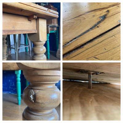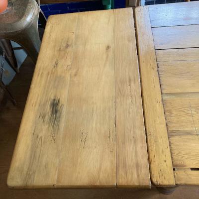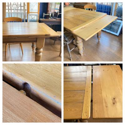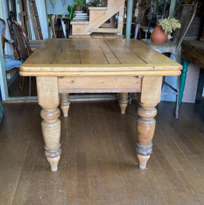 4人~最大8人までゆっくりと座ることができるオールドパインの伸縮テーブル。イギリス製、推定1940年代。【41-19】左右の天板が約45㎝ずつ伸びます。人数に応じて片方を伸ばしたり、両方を広げたりと臨機応変に使えて便利ですね。使い込まれた佇まいは届いたその日から、お部屋にしっかりと馴染んでくれますよ。引き出した天板には虫食い跡などがデザインを加えてくれているようで楽しめます。上下に2枚天板が重なっている構造になりますので、上の天板の下に固定用の金具が付属しています。コタツの天板のような仕組みと思っていただければわかりやすいかもしれません。店舗やホームパーティなど急な人数変化にも対応。お届け前に伸縮方法の動画を添付しておりますのでご安心ください。重量がありますので、大人2人以上での移動を推奨。ピカピカの新品よりも使い込まれた風合いがお好きな方におすすめ。福岡市南区の店舗にてお渡しもできますのでお気軽にどうぞ!