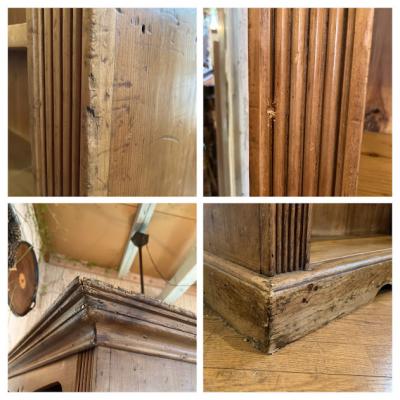 高さが約180㎝ほどの大きなオールドパインのブックシェルフ【41-249】イギリス製、推定1950年代。4段の棚板は固定式になっています。転倒防止で壁に固定をされていたため、裏面に3カ所穴が空いていました。高さがあるので、日本でご使用の場合も天井や壁に固定すると安心ですね。また、古い家具に多くみられるのですが、経年により裏板の間に少し隙間が開いています。側面には長く大切に使用された証として凹みや小さな傷を含みます。これらがあることで、このシェルフが届いたその日からずっとその場所にあったように、すぐ馴染んでくれると思います。キッチンや本棚で大容量のものをお探しの方、たくさん飾れるお店の什器をお探しの方におすすめ。サイズが大きいので搬入予定の場所に設置できるかご確認ください。福岡市内のみ無料(ご注文確定後に送料変更の手続きを行います)で配達します。福岡市南区の店舗にてお渡しもできますのでお気軽にどうぞ!